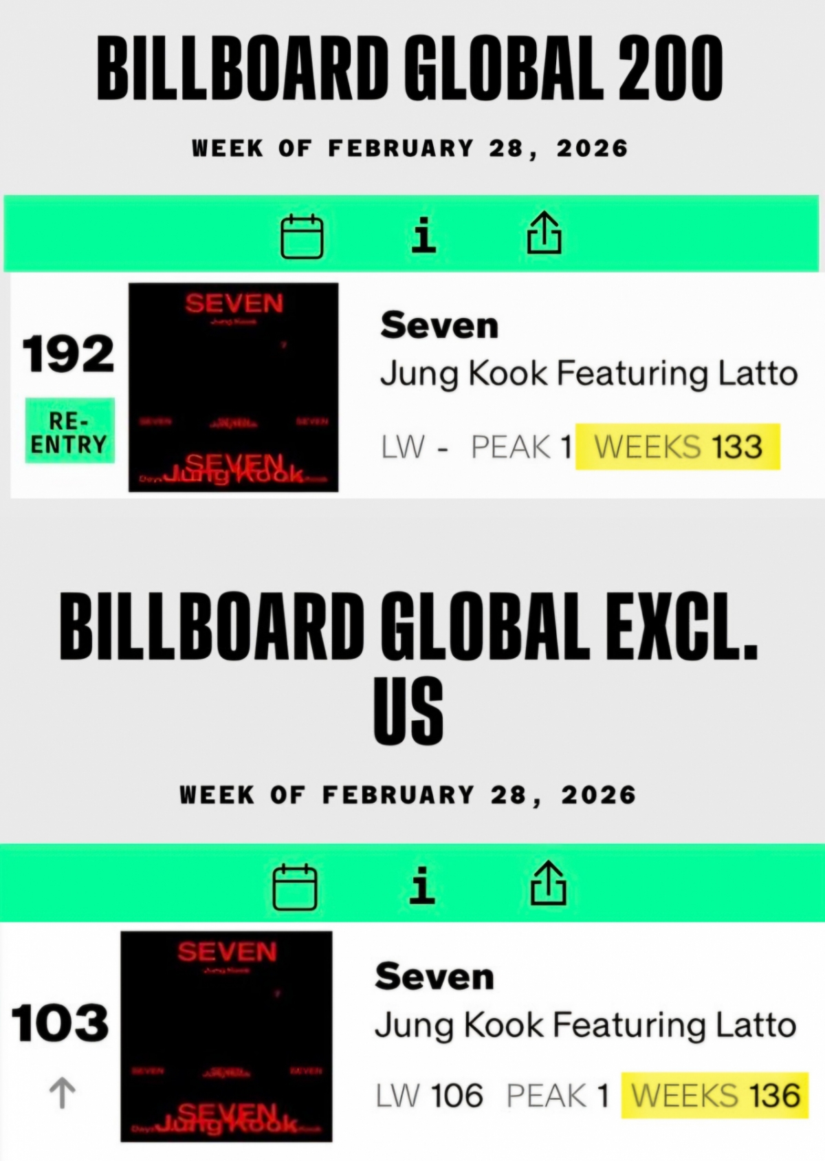 Theo BXH Global 200 phát hành ngày 28/2, ca khúc solo debut đầu tiên Seven của Jungkook đã chiếm giữ vị trí No.192.