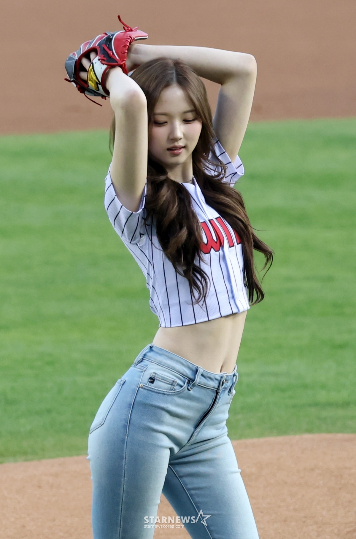 Thành viên Lee Ji Woo của nhóm nhạc Triple S đang ném bóng mở màn cho lời cầu nguyện chiến thắng của LG. Jung Ha Yeon đảm nhận vai trò ném bóng.
