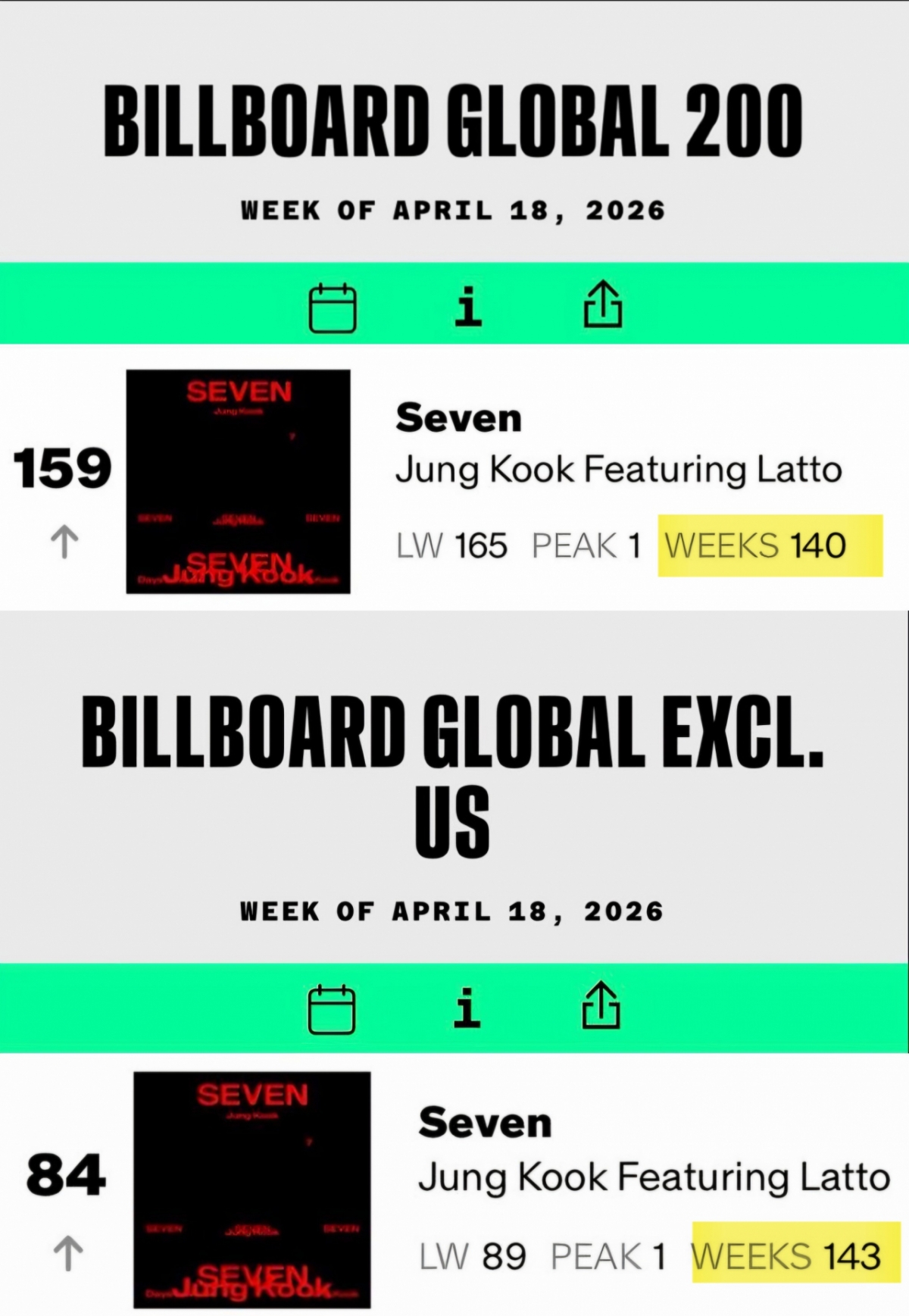 Ca khúc solo debut đầu tiên Seven của Jungkook đã leo lên vị trí 159 trên BXH Global 200 tính đến ngày 18/4 do tạp chí chuyên về âm nhạc Mỹ Billboard phát hành. Đây là thứ hạng tăng 6 bậc so với tuần trước.