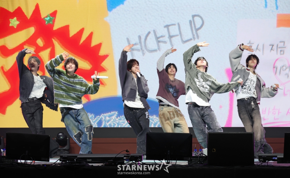Chiều 6/5, nhóm nhạc Kickflip đang trình diễn ca khúc chủ đề tại showcase kỷ niệm phát hành mini album vol.4 My First Kick tại Yes24 Live Hall, quận Gwangjin, Seoul.