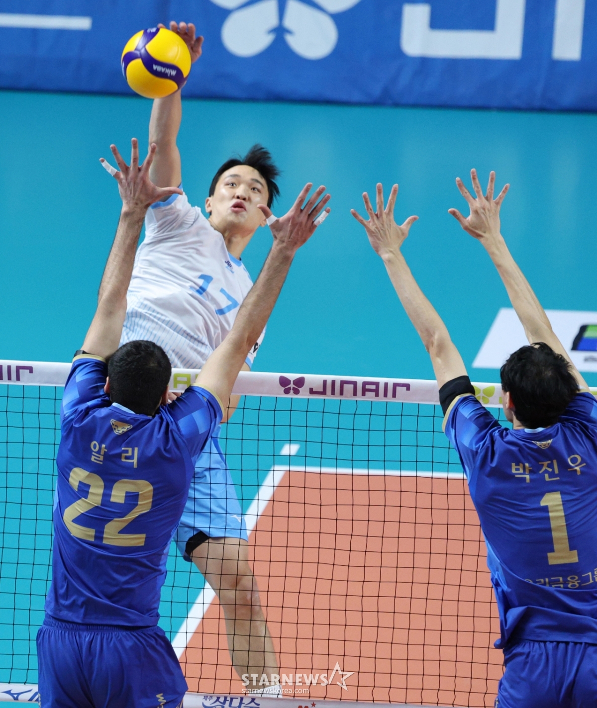 Hãng hàng không Hàn Quốc Lim Dong Hyuk đang tung ra một cú đánh mạnh mẽ phía trên việc chặn thẻ Ali và Park Jin Woo của chúng ta.