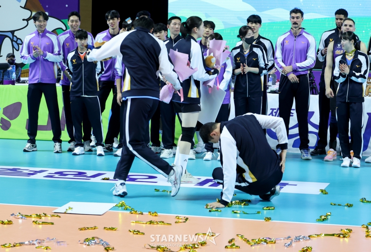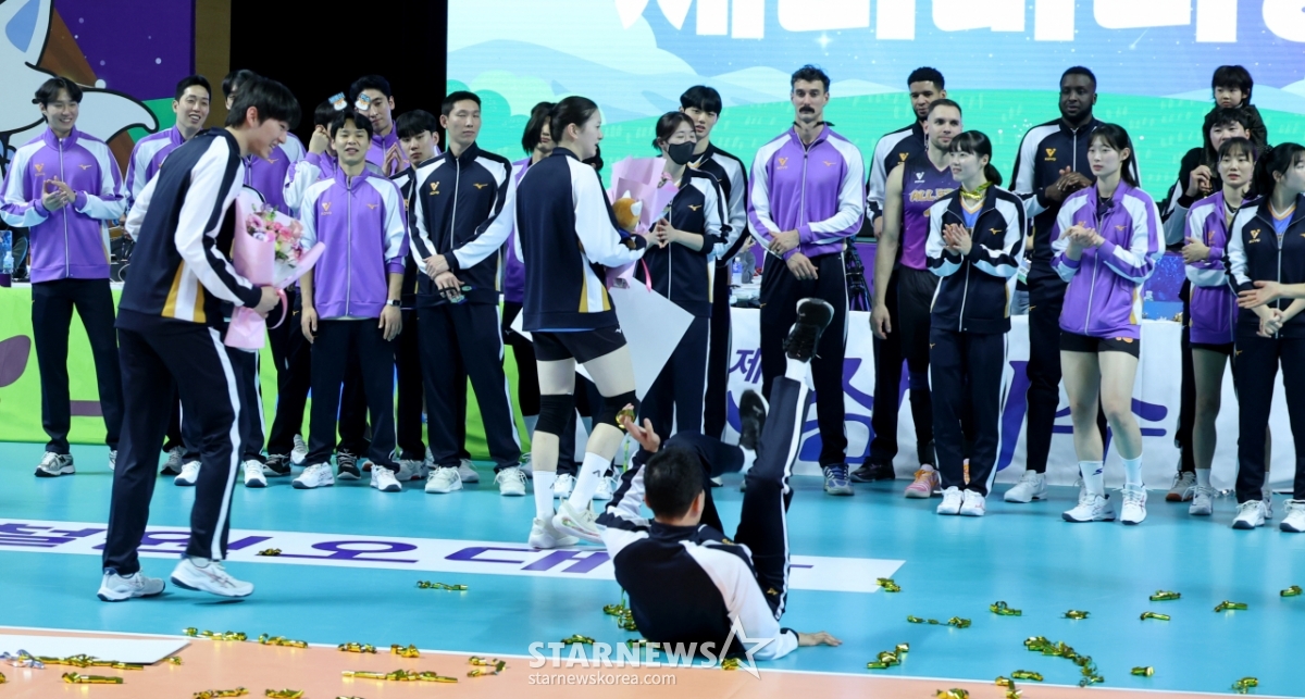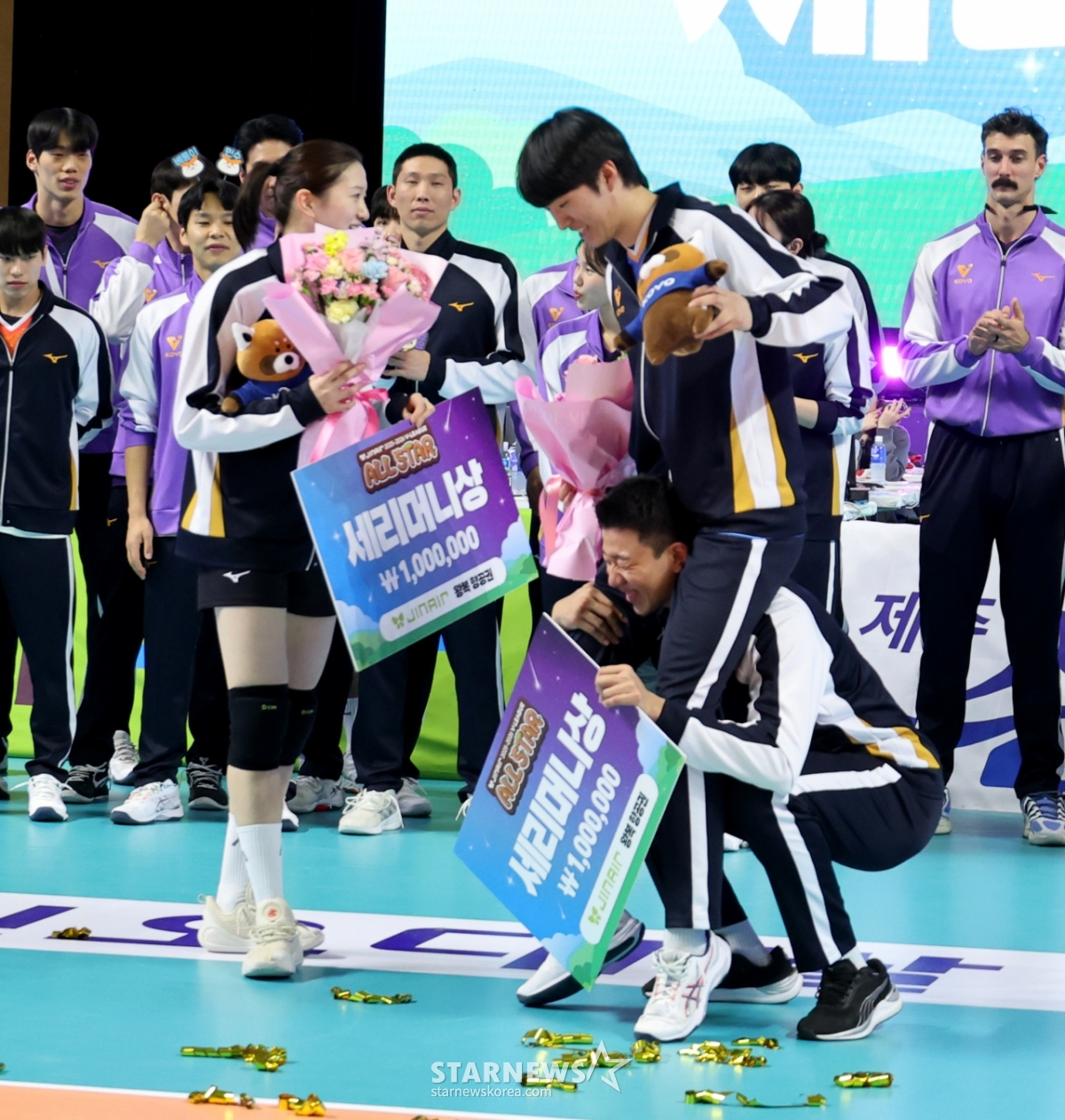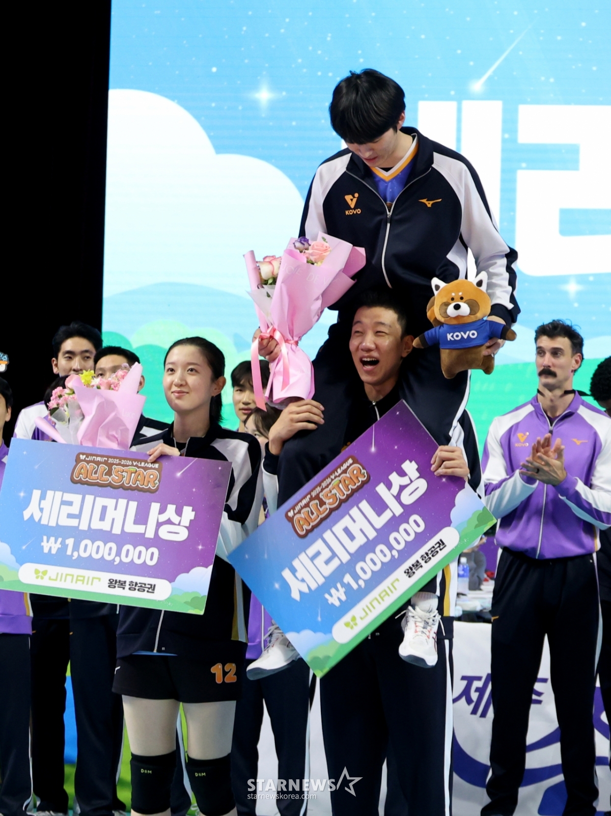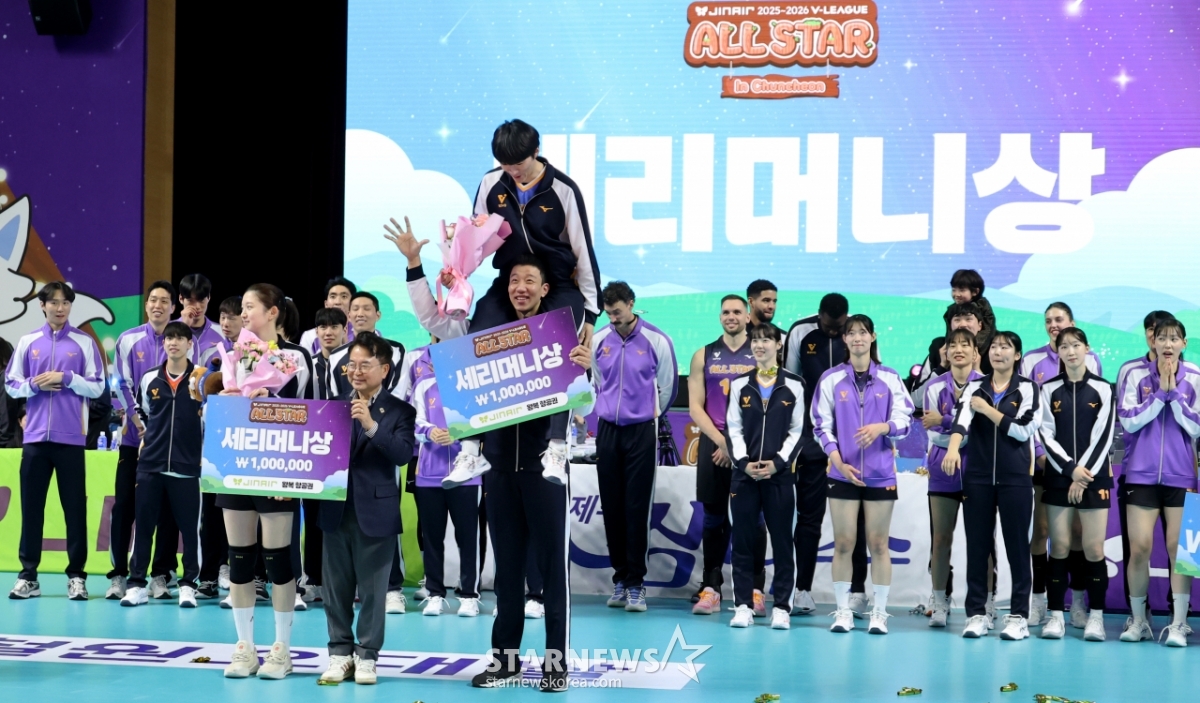 Đây là Shin Young Suk, người đã nhận được giải ăn mừngHyun đang chụp ảnh kỷ niệm sau khi kết thúc trận đấu All-Star của Jin Air V-League 2025-2026 được tổ chức tại Nhà thi đấu Hoban Chuncheon vào ngày 25. Trận All-Star diễn ra trong trận đối đầu giữa ngôi sao K và ngôi sao V, đã mang lại niềm vui cho người hâm mộ bằng cách tổ chức nhiều trận đấu khác nhau như Spike Sub và Libero Contest. 2026. 01.25.