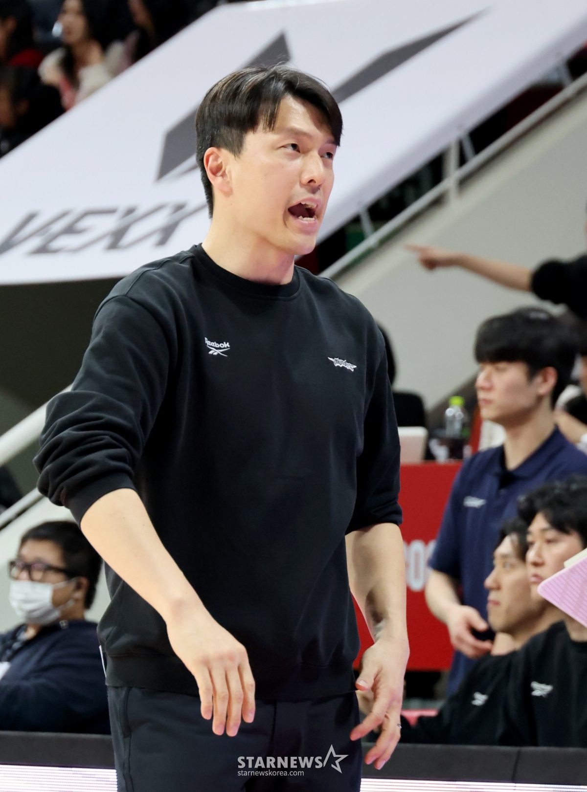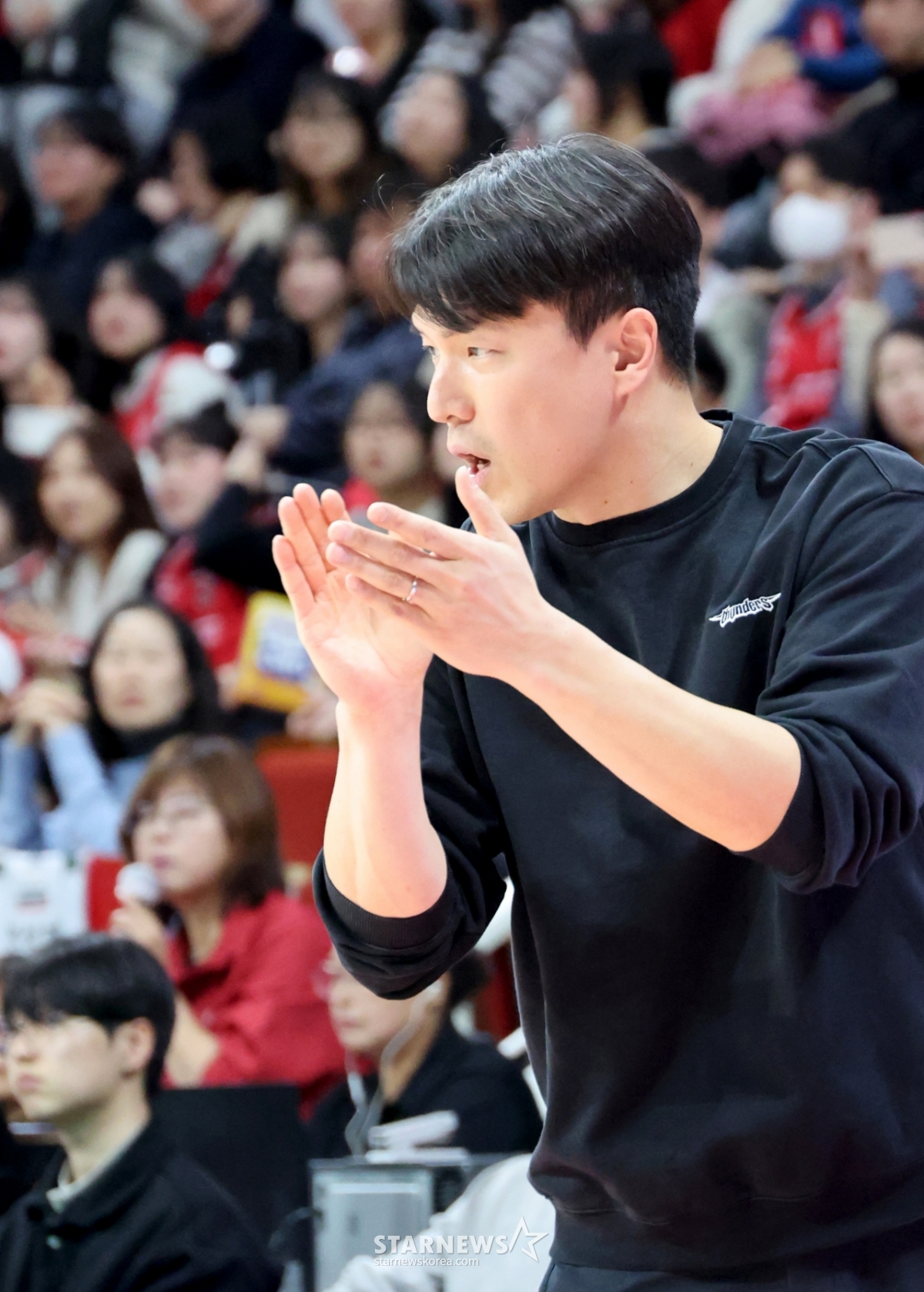 Huấn luyện viên Kim Hyo Bum của Samsung đang khuyến khích các cầu thủ trong trận đấu giữa đội trưởng đội bóng rổ chuyên nghiệp LG 2025-2026 được tổ chức tại Nhà thi đấu Anyang vào ngày 29. 2026.01.29.