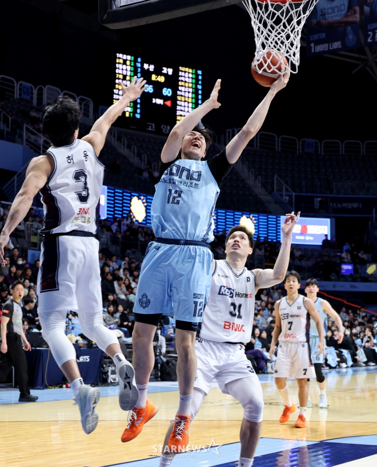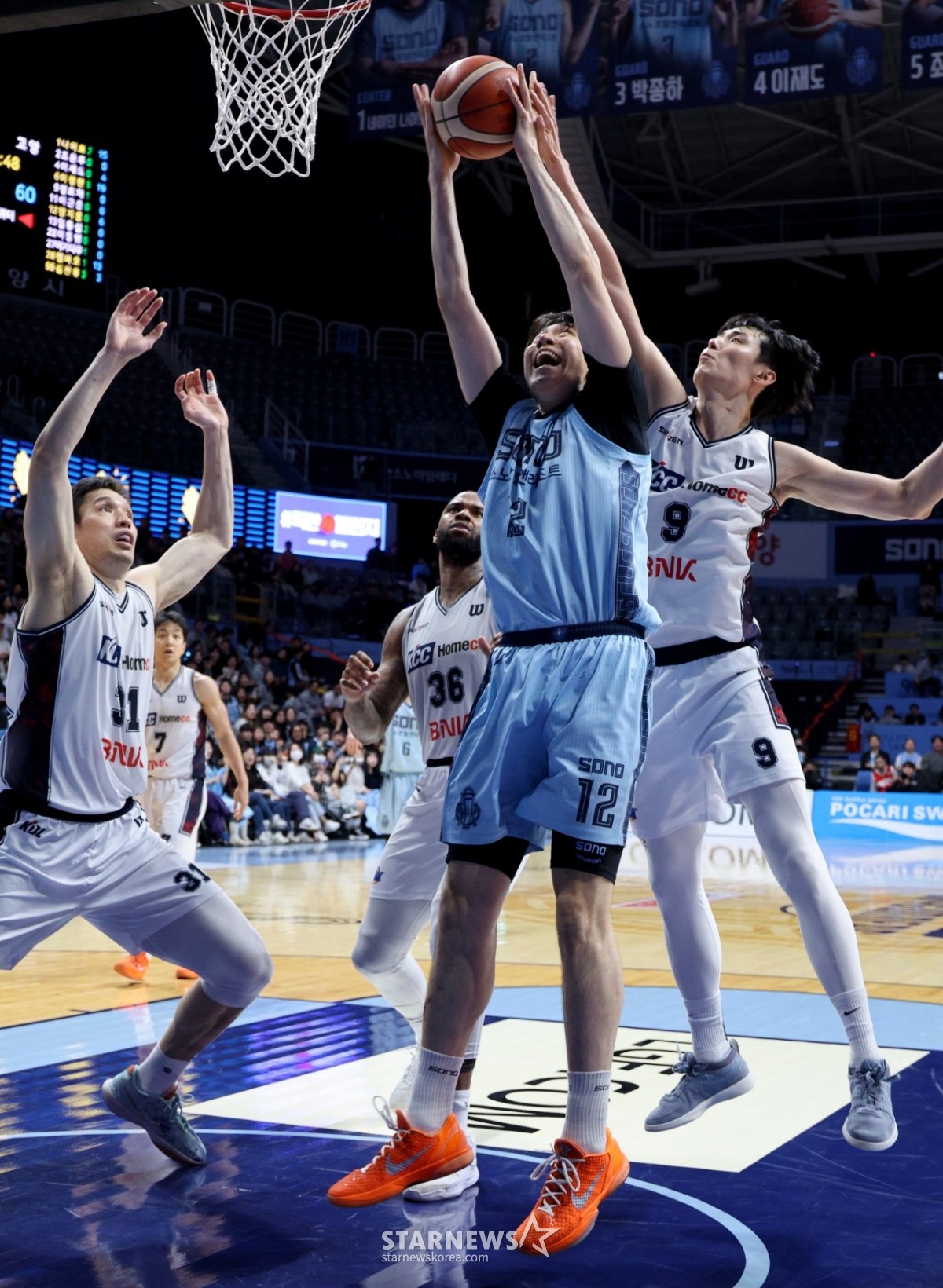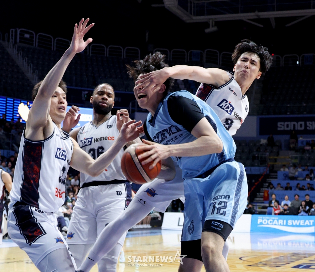 Sono Kang Ji-hoon đang chơi rebound sau khi thất bại trong việc sút bóng trong trận đấu KCC Busan với đội bóng rổ chuyên nghiệp Goyang Sono 2026 của LG Electronics được tổ chức tại Goyang Sono Arena vào ngày 4. 2026.02.04.