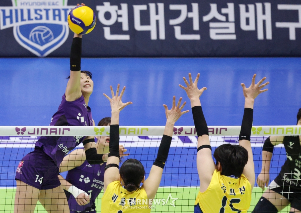 Jung Yoon Joo của Bảo hiểm nhân thọ Heungkuk đang ném một cú strike mạnh mẽ qua việc chặn bóng của công ty xây dựng Hyundai Lee Ye Rim và Kim Hee Jin.