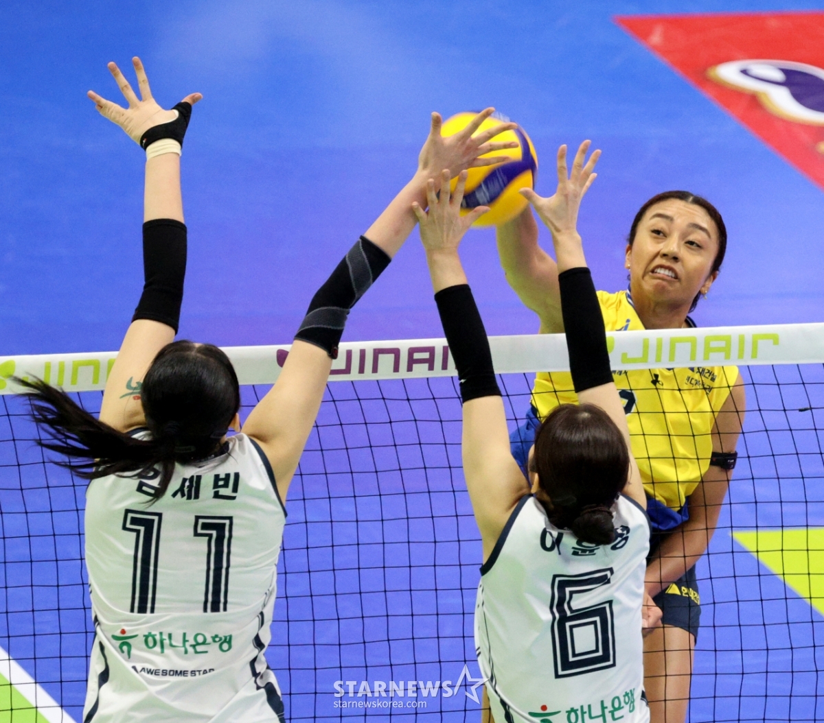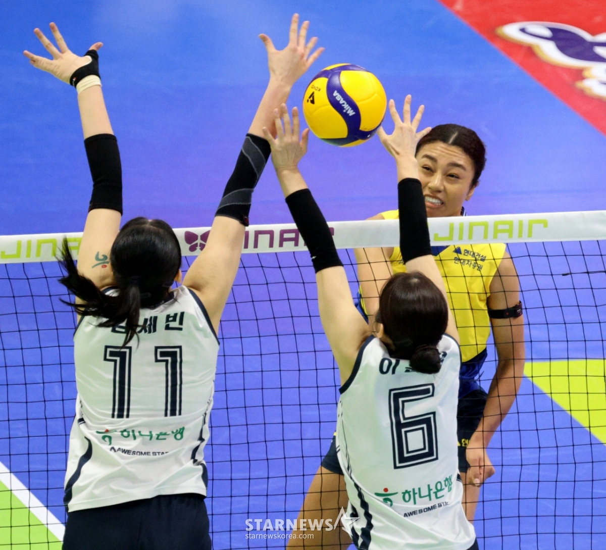 Hyundai Zastis đã tạo ra một cú đánh mạnh vào việc chặn hai lần xây dựng đường bộ trong trận đấu giữa Hyundai E&C và Korea Express V League 2026 được tổ chức tại Nhà thi đấu Suwon vào ngày 13. 2026.02.13.