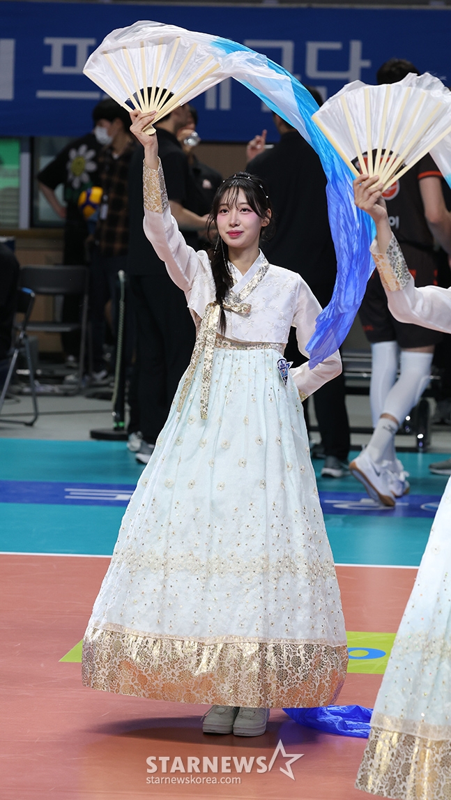 Đội cổ vũ thẻ tín dụng của chúng tôi đang cổ vũ cho tập đặc biệt Tết trong bộ hanbok này.