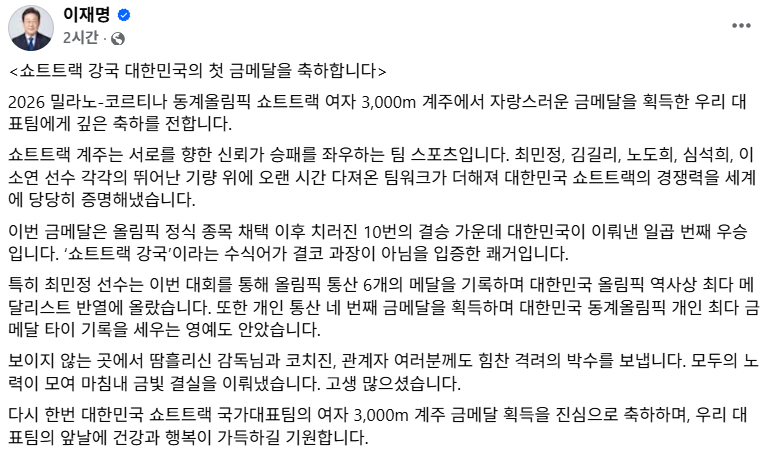 Tổng thống Lee Jae-myung đã gửi lời chúc mừng sâu sắc đến đội tuyển quốc gia Hàn Quốc đã giành huy chương vàng trong cuộc chạy tiếp sức 3000m nữ tại Thế vận hội mùa đông Milan và Cortina Dampecho 2026 "Gửi lời chúc mừng sâu sắc đến đội tuyển quốc gia Hàn Quốc đã giành huy chương vàng đáng tự hào".
