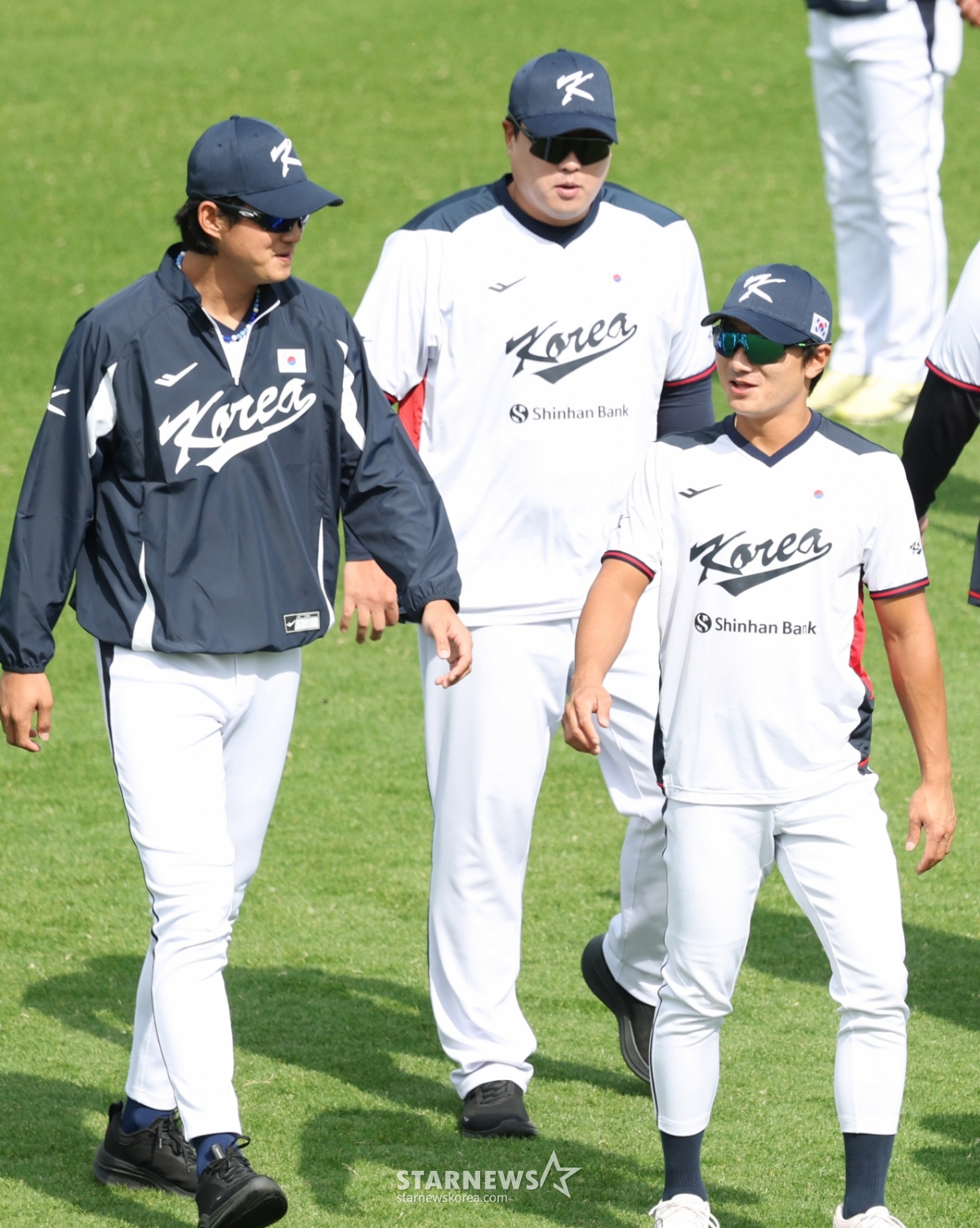 Koo Ja-wook, Ryu Hyun-jin và Shin Min-jae đang tập giãn cơ bằng cách nói chuyện.