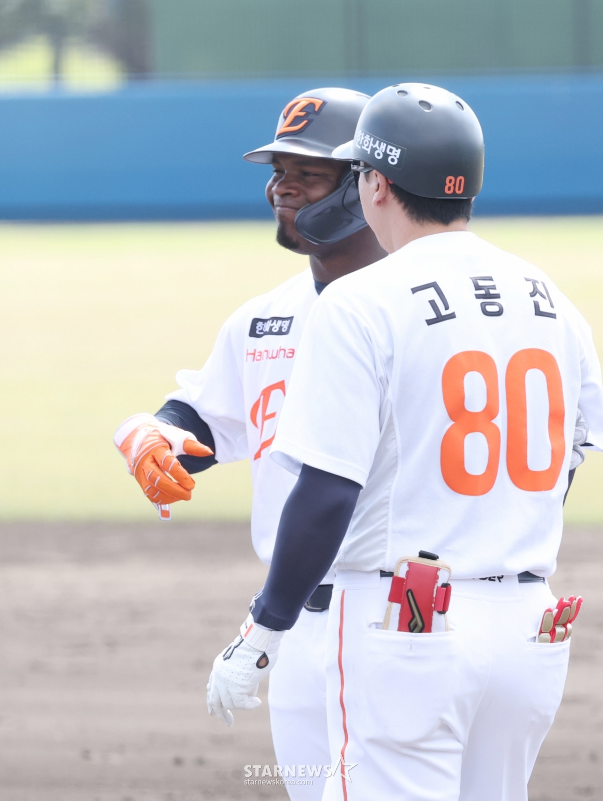 Huấn luyện viên Go Dong Jin đang nhận được sự hoan nghênh của huấn luyện viên sau khi Hanwha Ferrazza tấn công đội tuyển quốc gia Song Seung Gi, đánh một cú đánh trúng bóng và xuất phát.