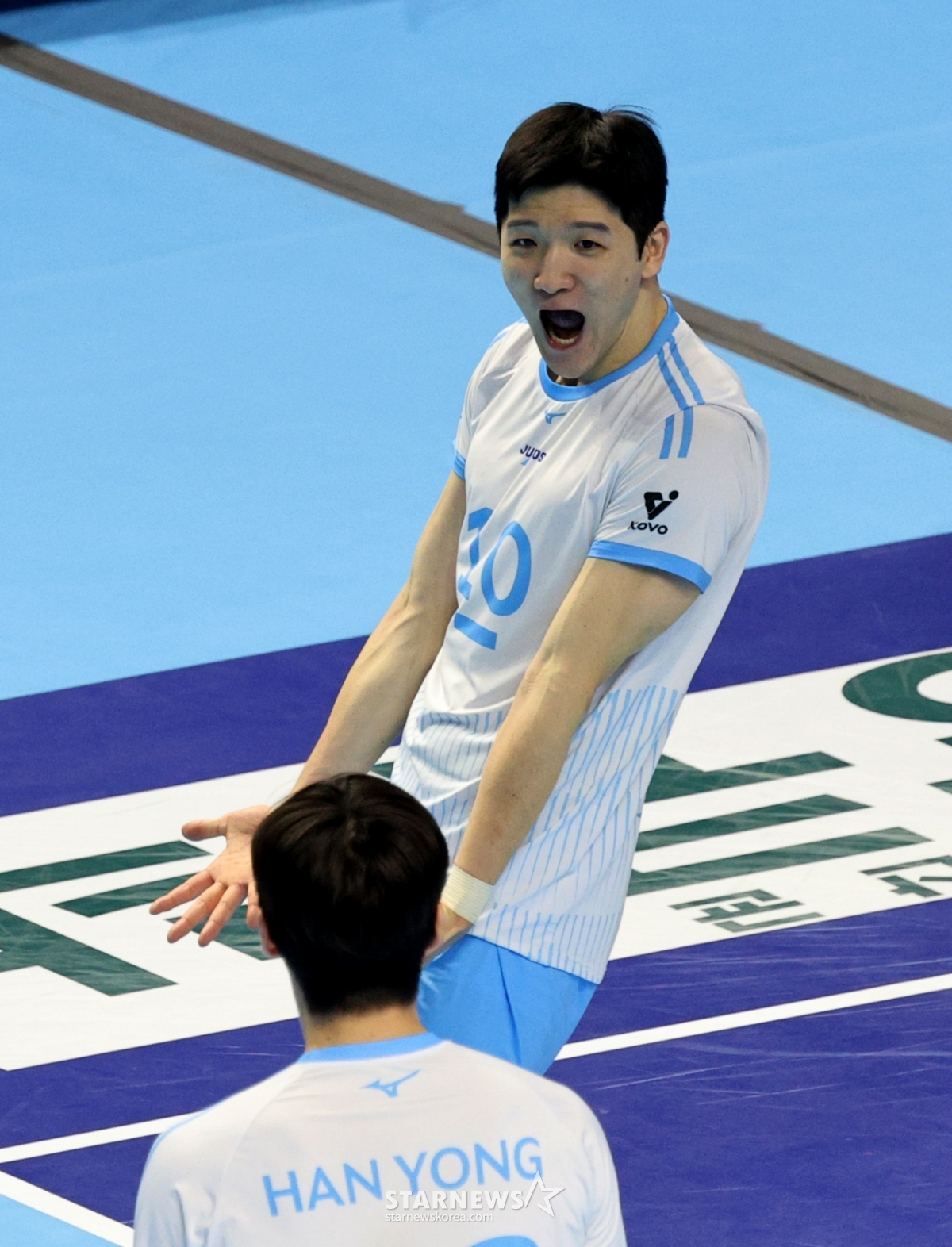 Jung Ji-seok của Korean Air và các cầu thủ đang reo hò khi ghi bàn trong trận đấu giữa Korean Air và Hyundai Capital ở giải đấu 2025-2026V được tổ chức tại Nhà thi đấu Gyeyang vào ngày 22. 2026.02.202.