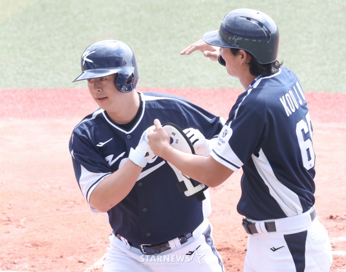 Đội tuyển quốc gia Noh Si Hwan đang nhận được sự hoan nghênh của Koo Ja Wook sau khi đánh một cú homerun 2 điểm trước Hanwha tuyển chọn White ở gôn 1 vô sự vào đầu hiệp 2.