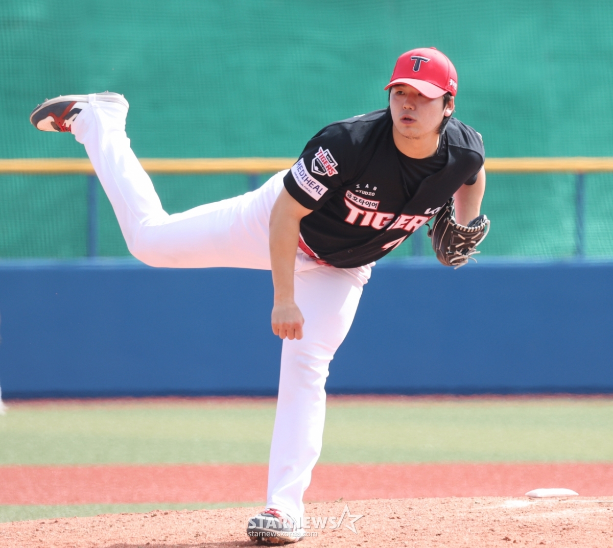 Kia Hwang Dong Ha đang ném bóng ngược lại.
