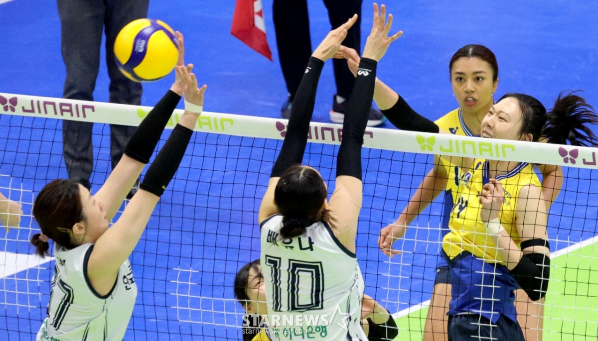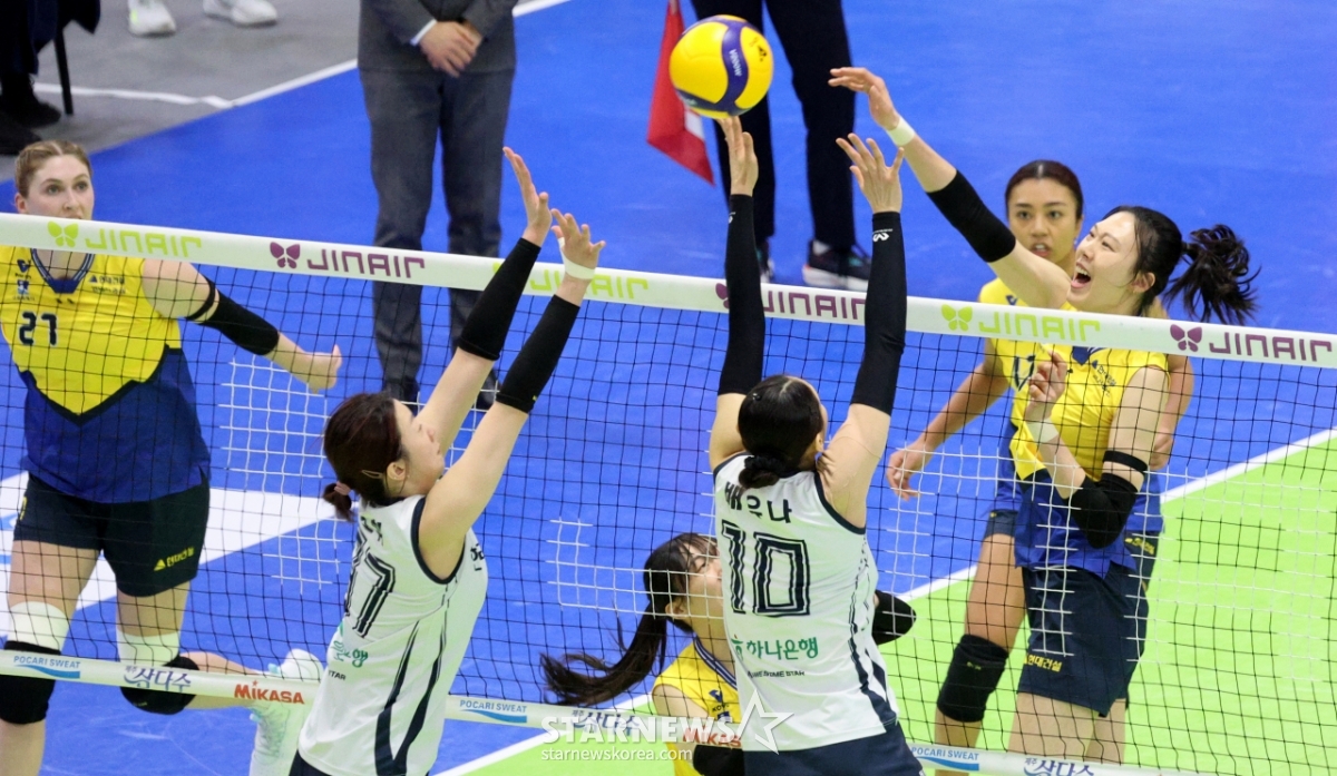 Yang Hyo-jin của Hyundai đã thực hiện một cú đánh mạnh mẽ để tránh chặn việc xây dựng đường bộ trong trận đấu giữa Hyundai E&C ở hạng mục nữ giải đấu 2025-2026V được tổ chức tại Nhà thi đấu Suwon vào ngày 24. 2026.02.24.