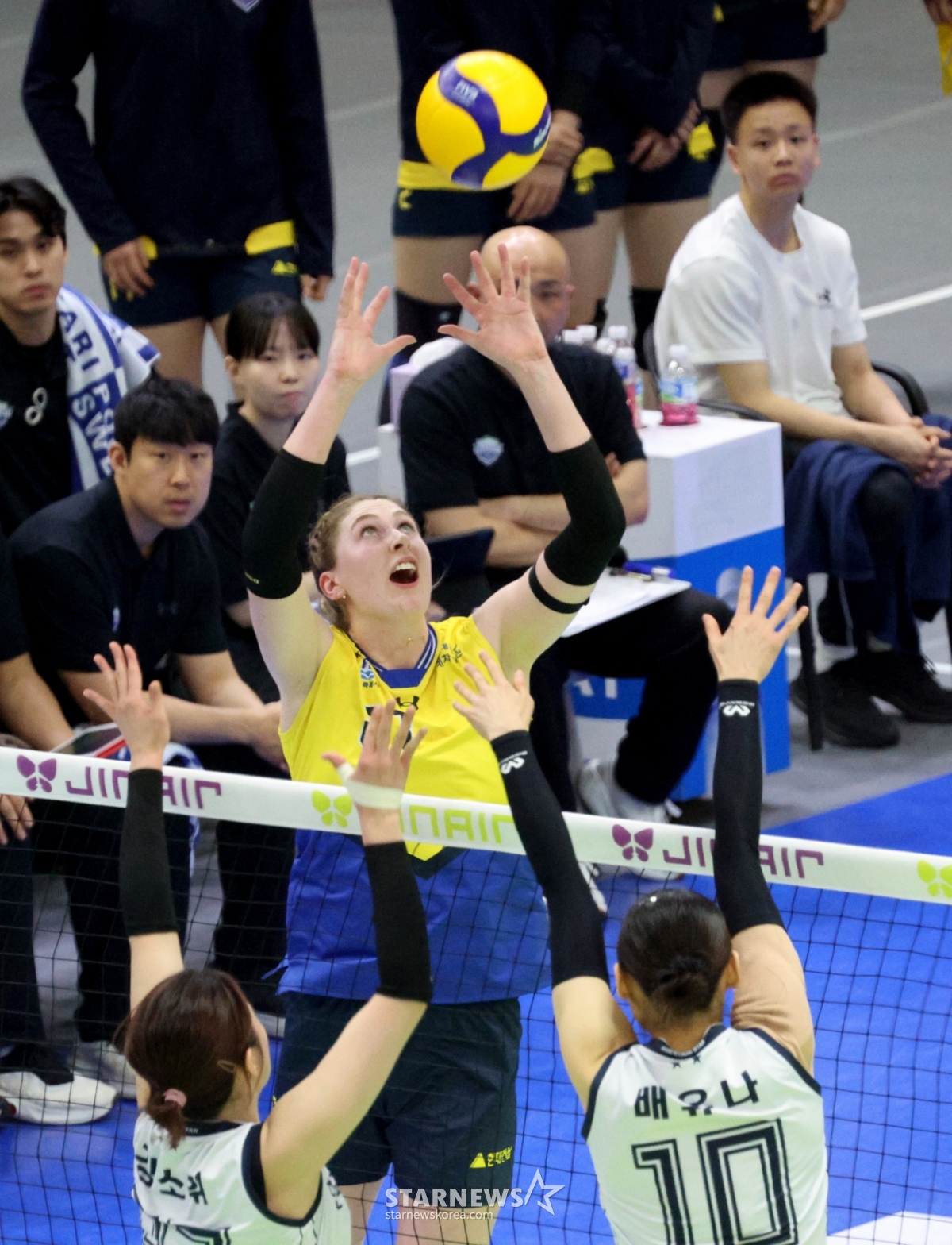 Hyundai Cari đang cố gắng đẩy nó vào ngày 24 khi nó không đúng thời điểm trong trận đấu giữa Hyundai E&C ở hạng mục nữ của giải đấu 2025-2026V được tổ chức tại Nhà thi đấu Suwon. 2026.02.24.