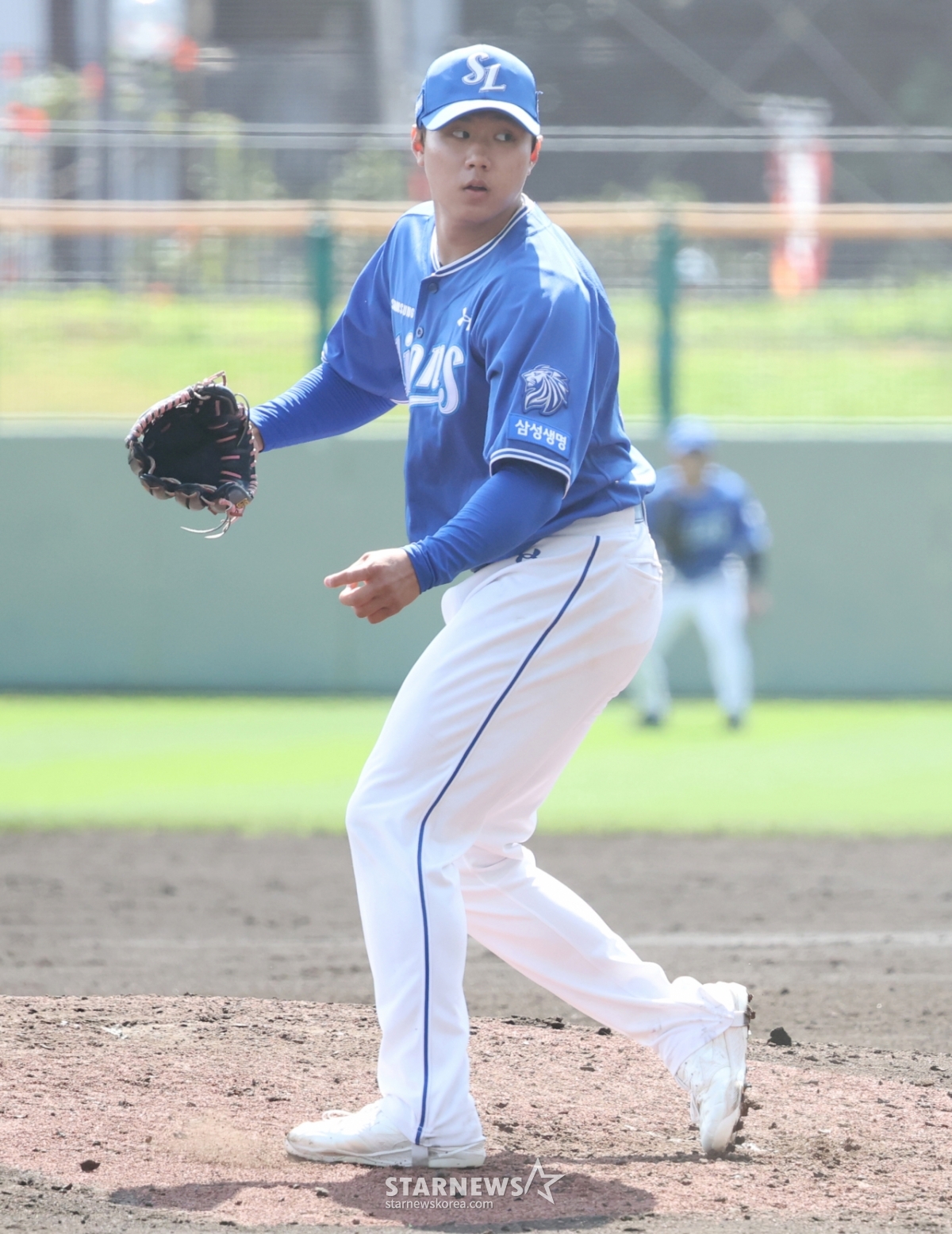 Samsung Bae Chan Seung đang ném bóng ngược lại.