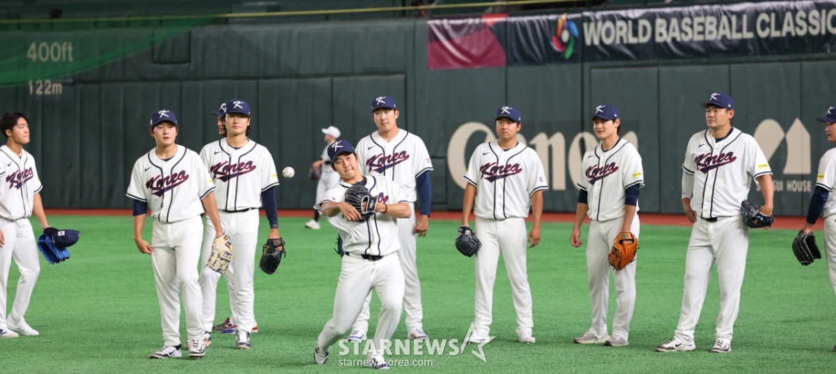 Cầu thủ ném bóng của đội tuyển bóng chày quốc gia Park Young-hyun đang tập luyện phòng ngự tại Tokyo Dome vào ngày 4, một ngày trước khi khai mạc vòng đấu Tokyo 2026WBC. 2026.03.04.