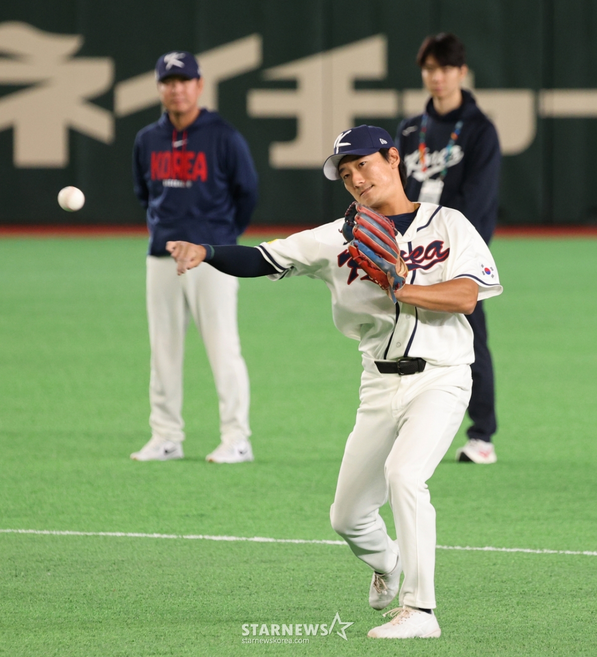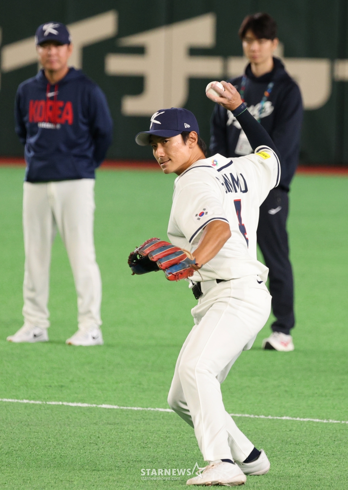 Cầu thủ sân trong của đội tuyển bóng chày quốc gia Shin Min Jae đang tập luyện phòng ngự sân trong sự theo dõi của huấn luyện viên Ryu Ji Hyun tại Tokyo Dome vào ngày 4, một ngày trước khi khai mạc vòng đấu Tokyo 2026WBC. 2026.03.04.