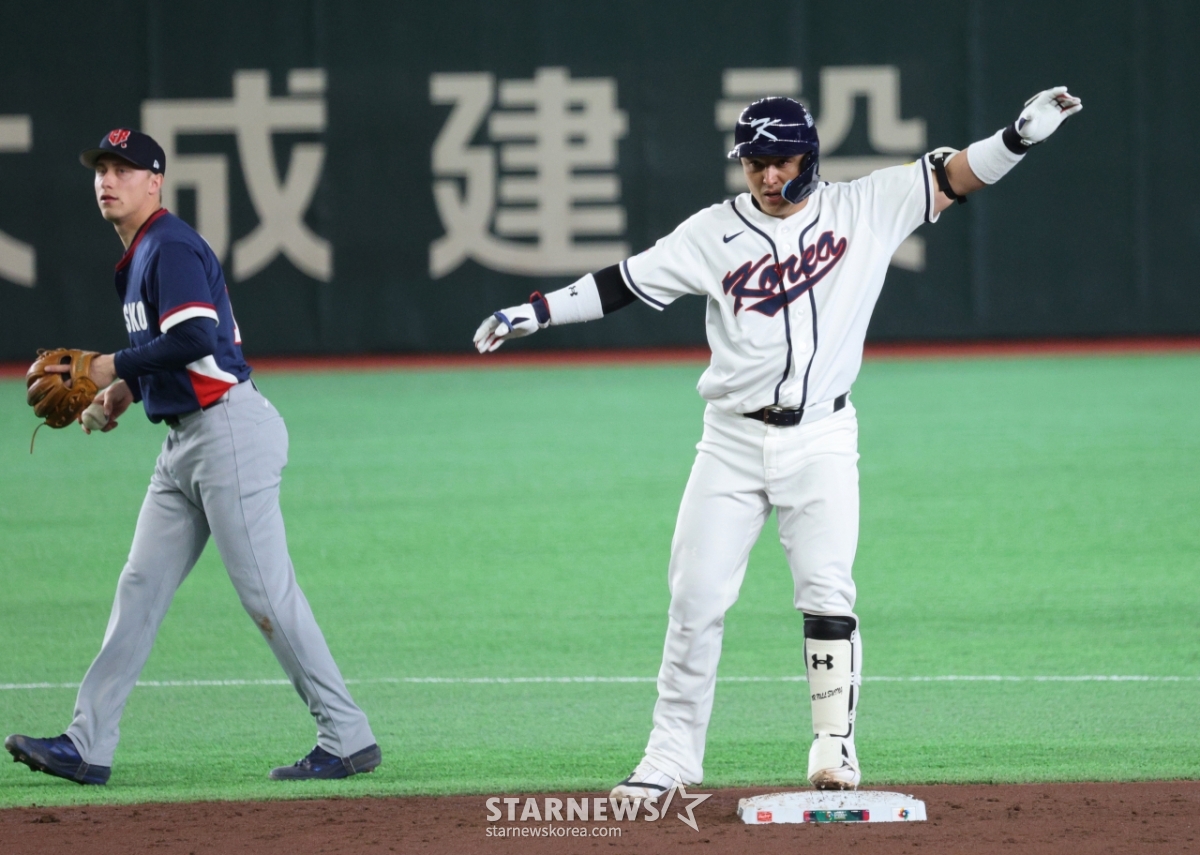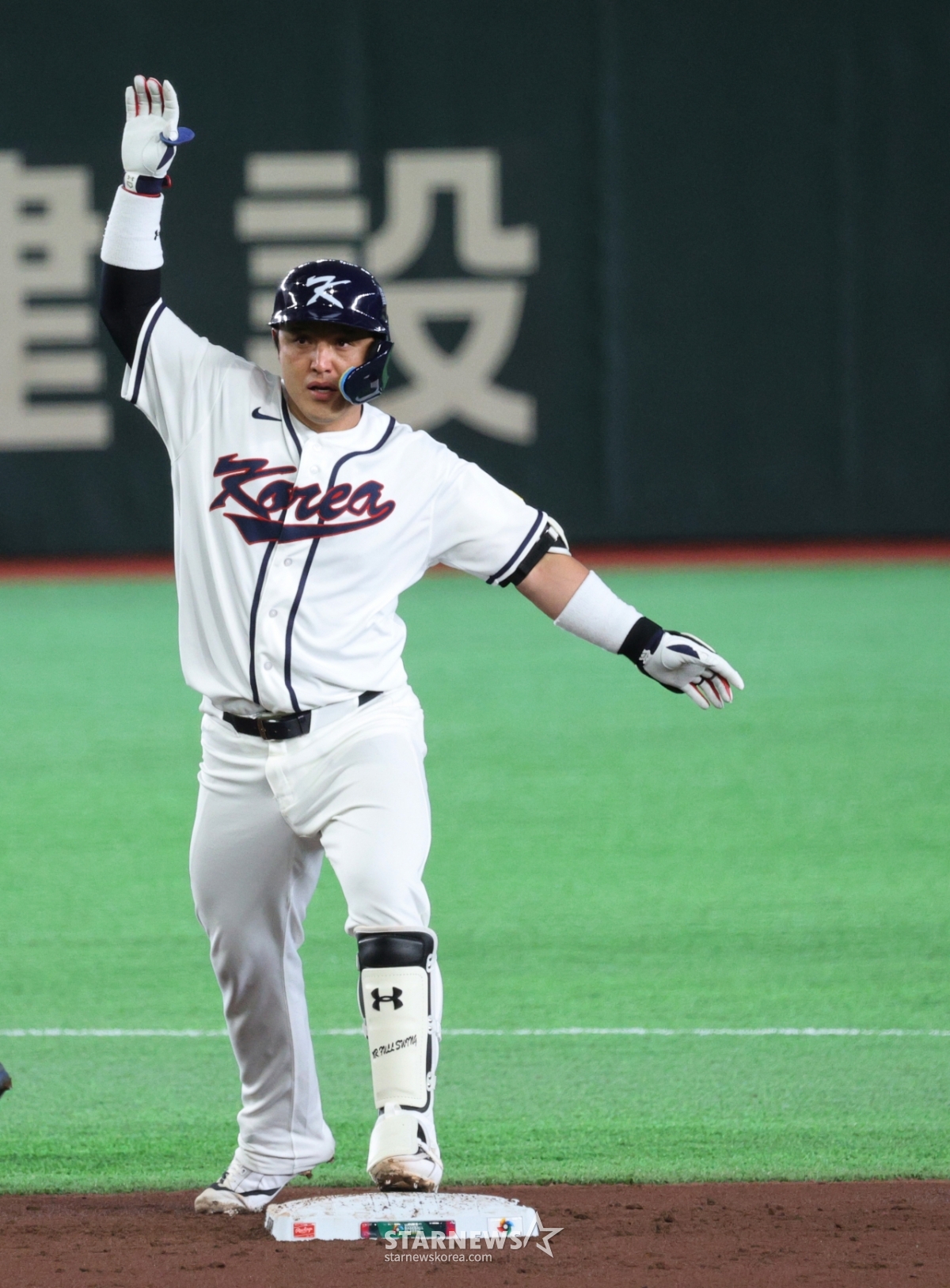 Park Dong Won, người đánh bóng số 8 của đội tuyển bóng chày quốc gia, đang tự chúc mừng mình bằng cú đúp trong trận đấu thứ hai khai mạc TokyoPOOL 2026WBC được tổ chức tại Tokyo Dome vào ngày 5. 2026.03.05.