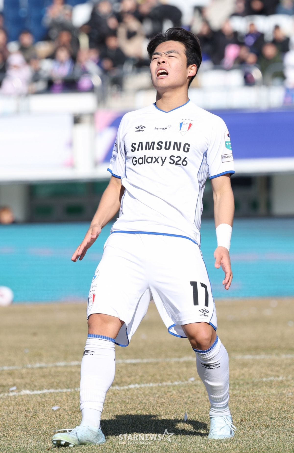 Suwon Samsung Kang Hyun-mook đang tiếc nuối khi cú sút quyết định bị lệch hướng.
