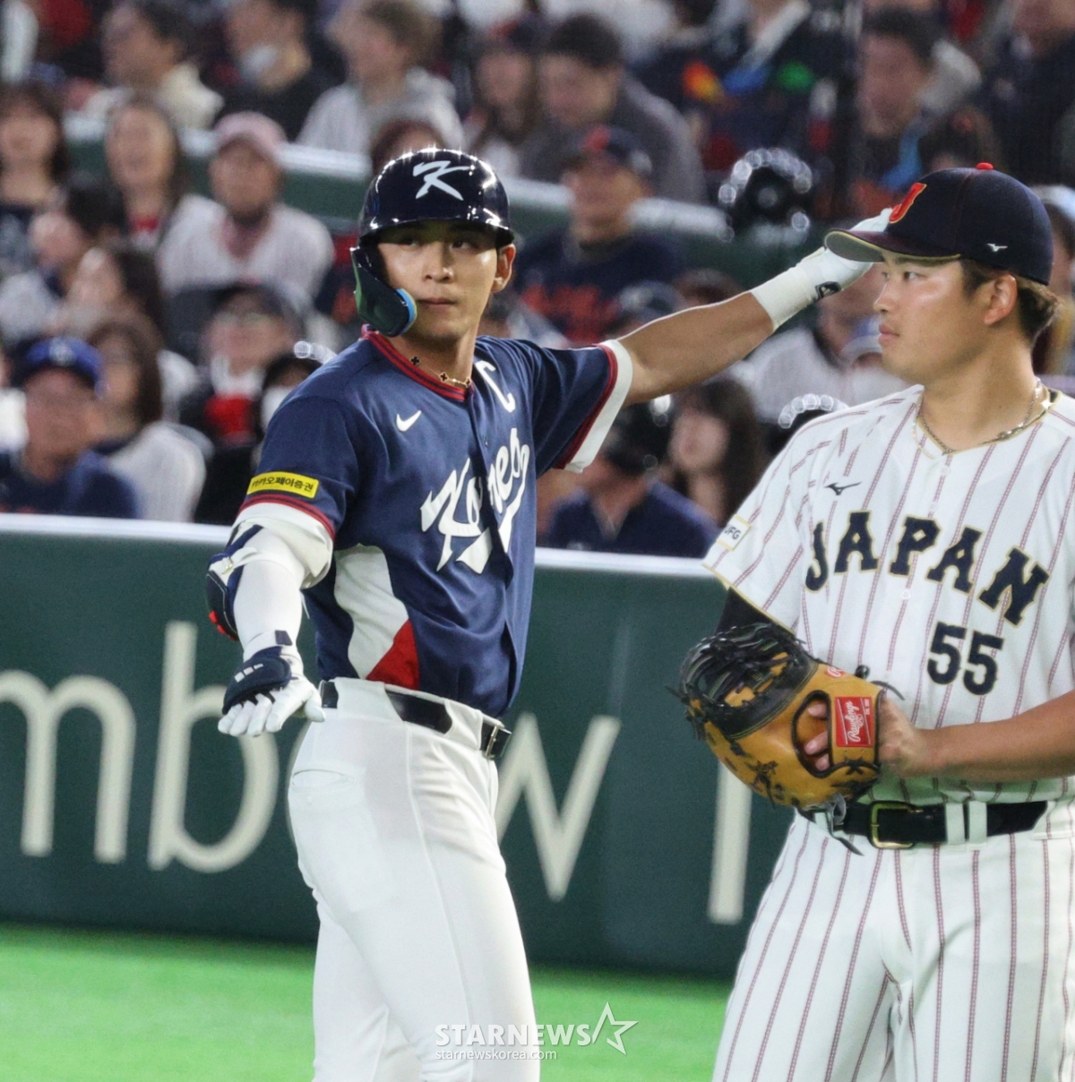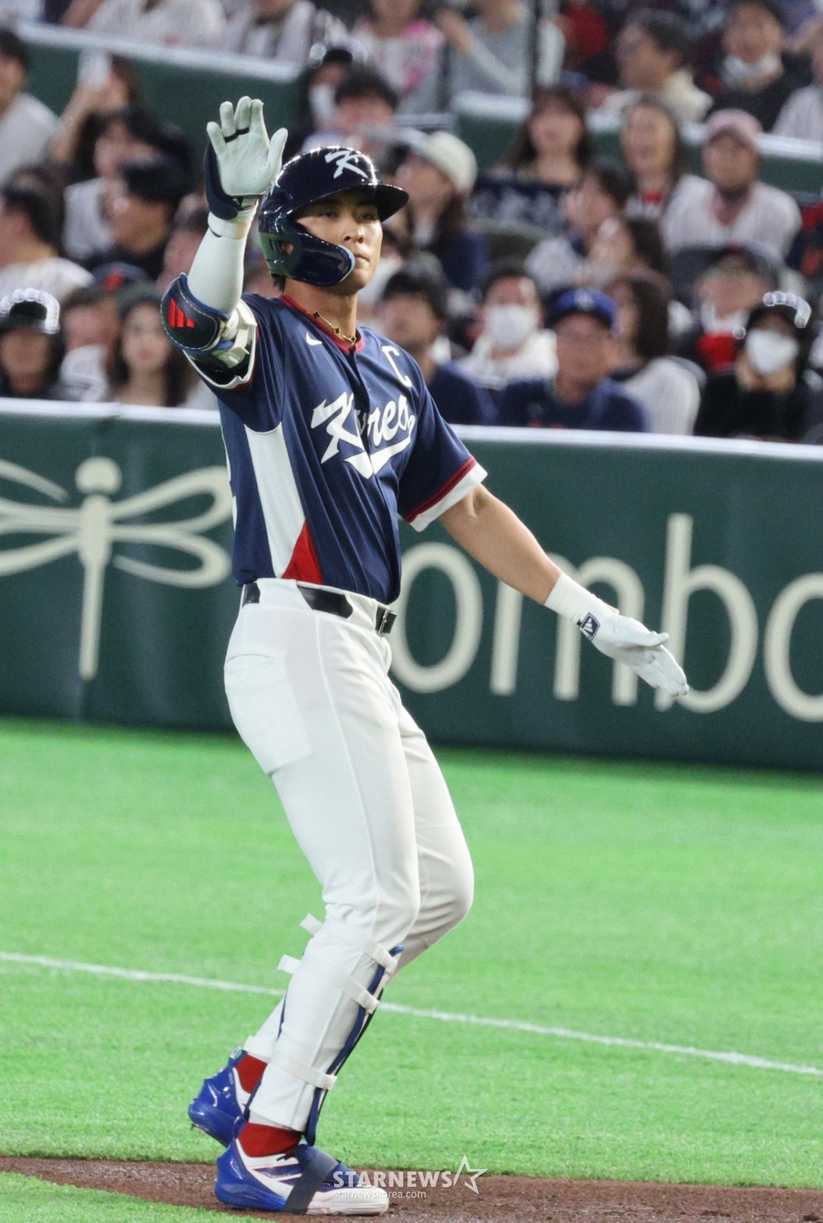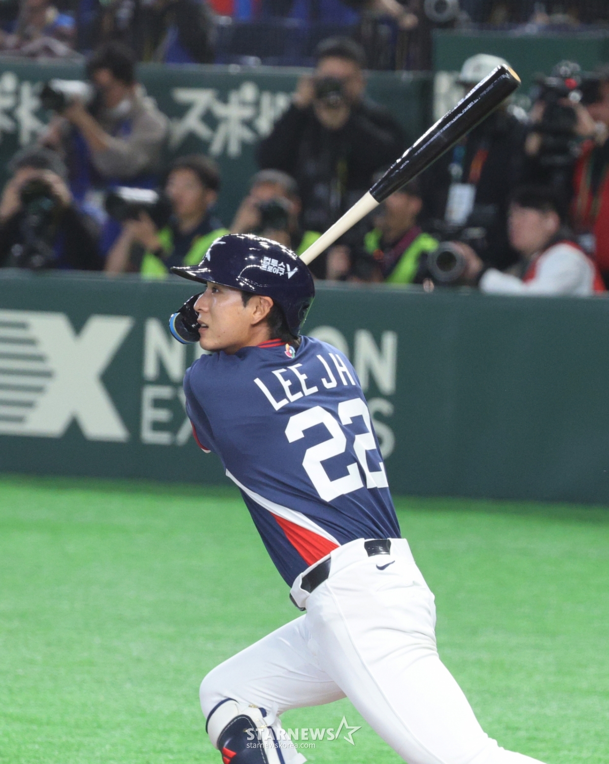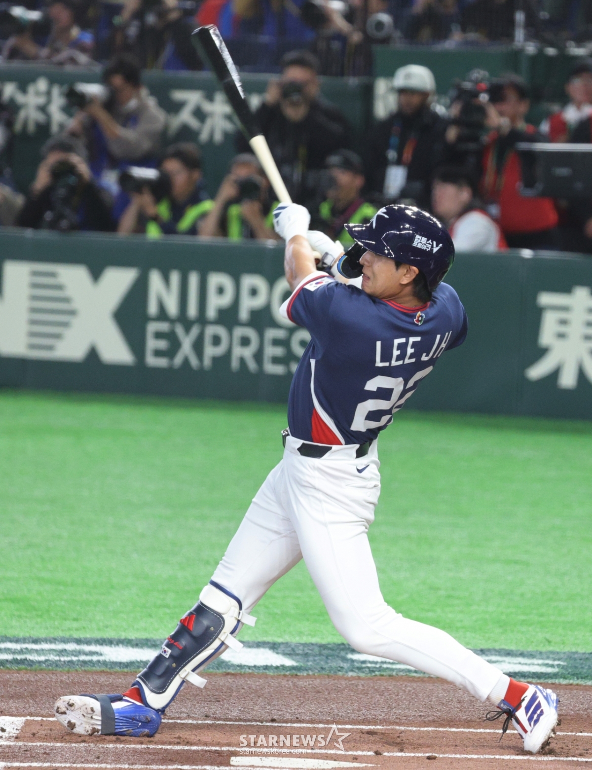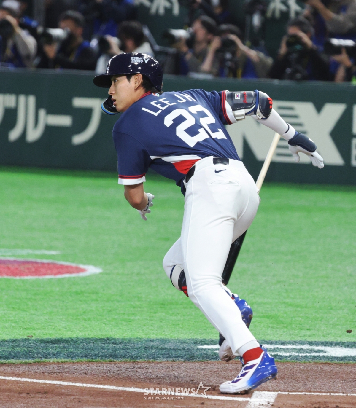 Lee Jung-hoo, người đánh bóng thứ ba của Hàn Quốc, đang xuất phát với một cú đánh trúng bóng ở gôn 1, 3 trước Kikuchi của Hàn Quốc và Nhật Bản trong hiệp đầu tiên của trận đấu 2026WBC TokyoPOOL được tổ chức tại Tokyo Dome vào ngày 7. 2026.03.05.
