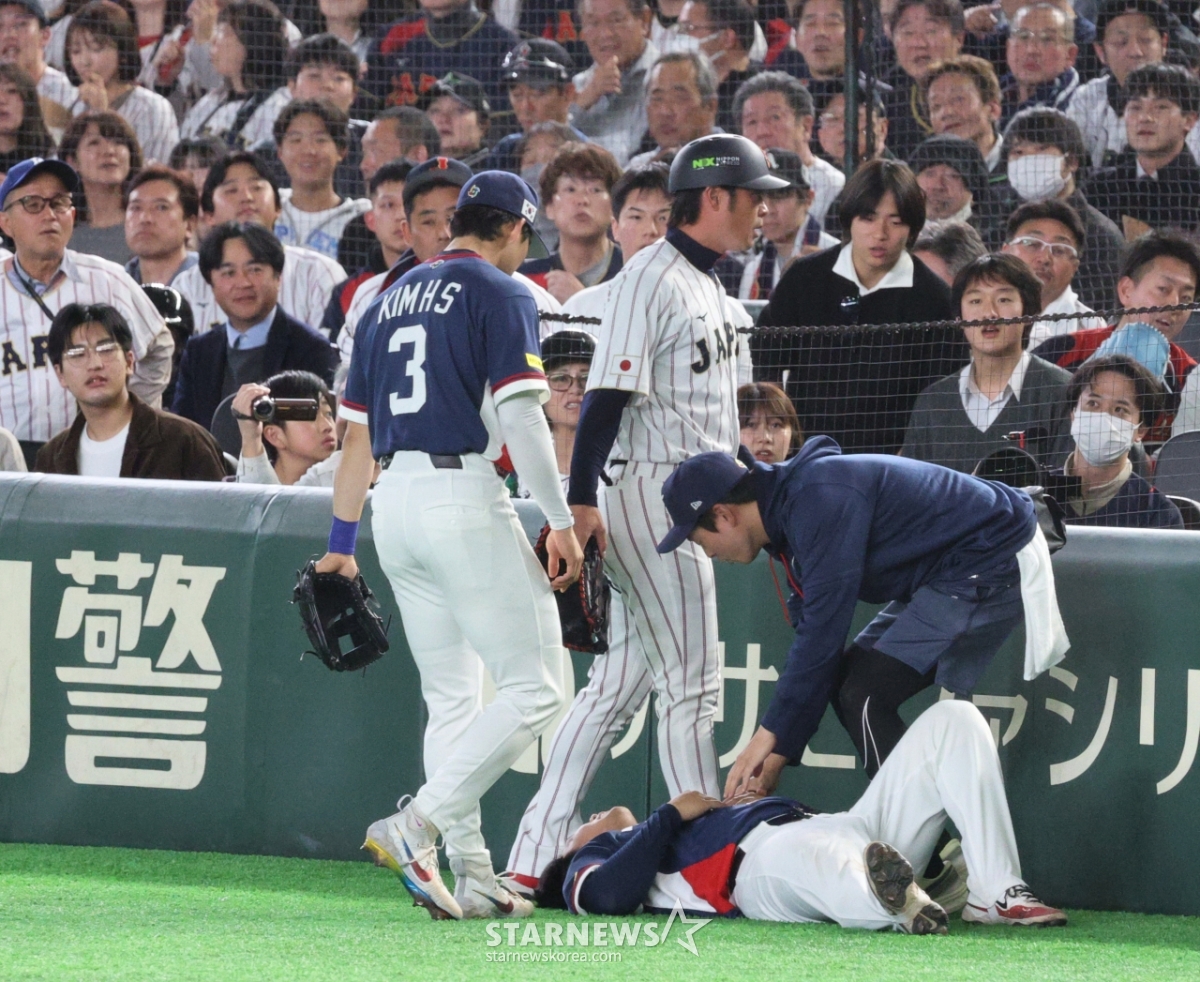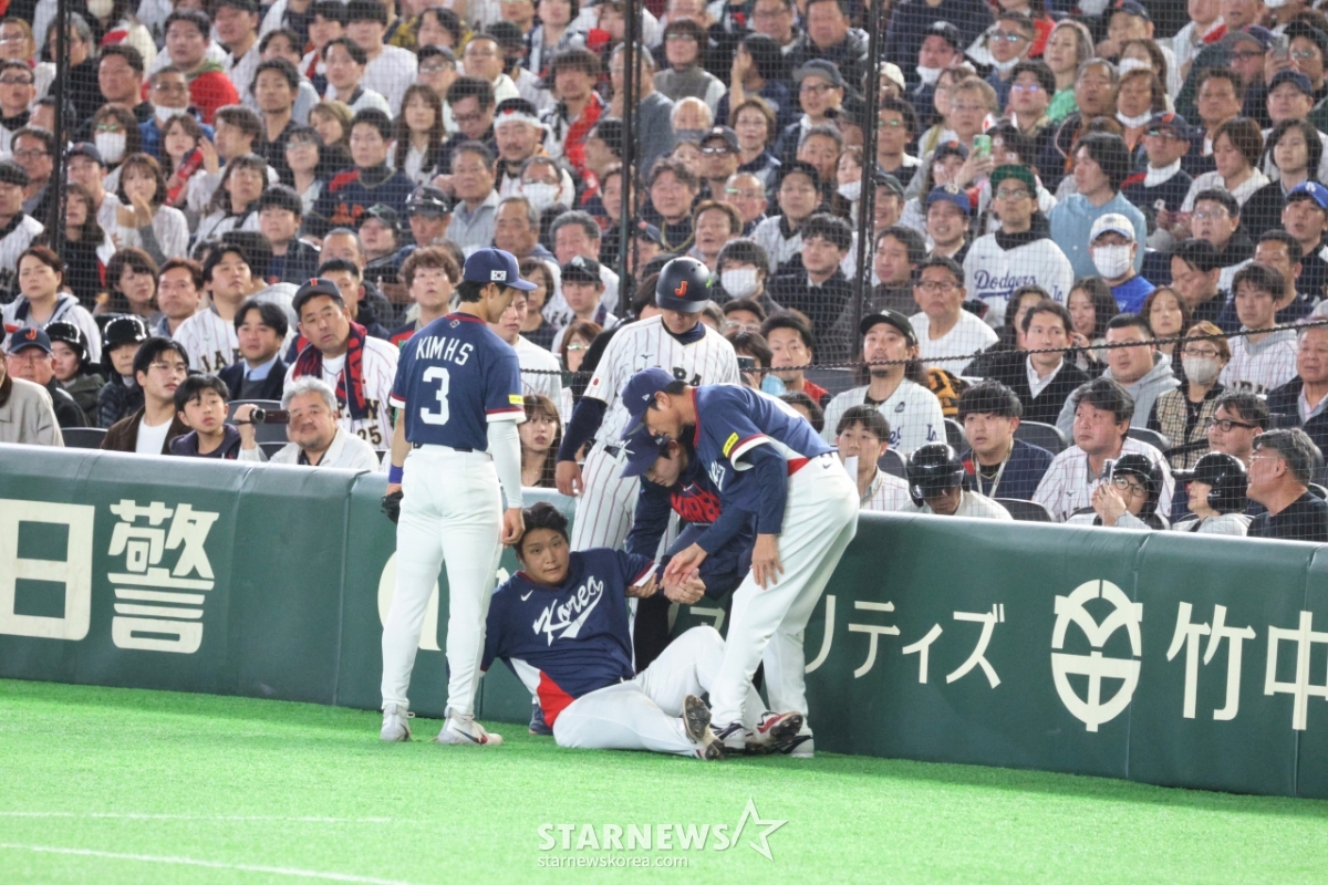 Cầu thủ chốt gôn 1 Moon Bo Kyung đã phải đối mặt với tình huống choáng váng khi bị hàng rào trong phòng thủ phạm lỗi ở cuối hiệp thứ 7 của trận đấu giữa Hàn Quốc và Nhật Bản 2026WBC TokyoPOOL được tổ chức tại Tokyo Dome vào ngày 7. May mắn thay, Moon Bo Kyung đã trở lại phòng thủ sau khi thở hổn hển. 2026.03.07.