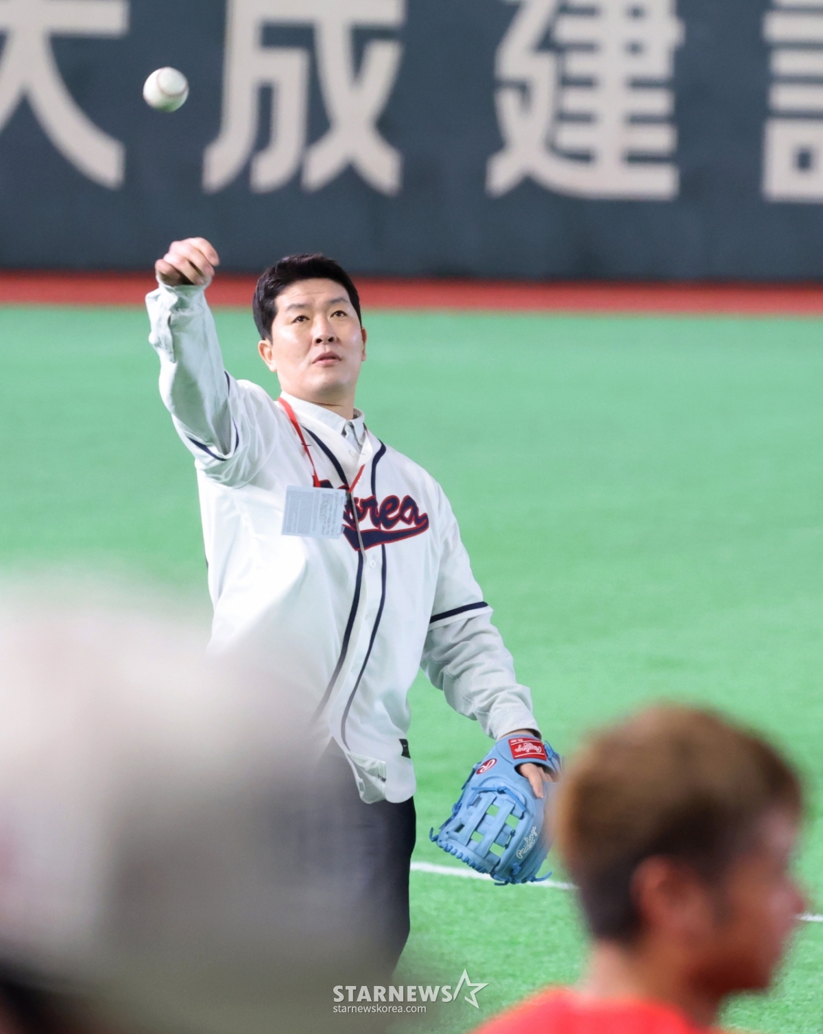 Kim Byung Hyun, người hoạt động tích cực với tư cách là một đài truyền hình tại Major Leaguer, đang giúp NCT Johnny luyện tập ném bóng mở màn trước trận đấu giữa Hàn Quốc và Đài Loan 2026 WBC TokyoPOOL được tổ chức tại Tokyo Dome vào ngày 8. 026.03.08.