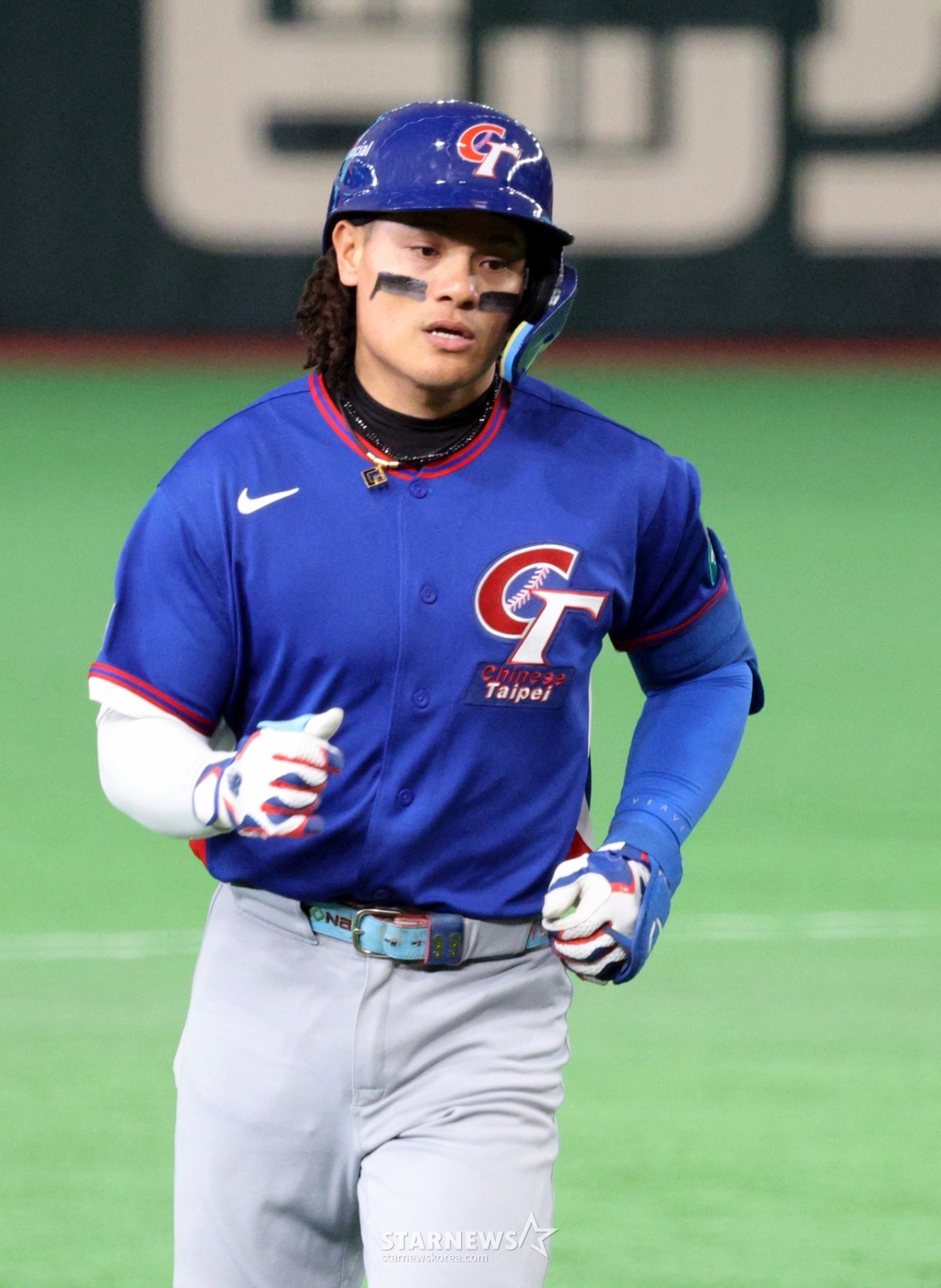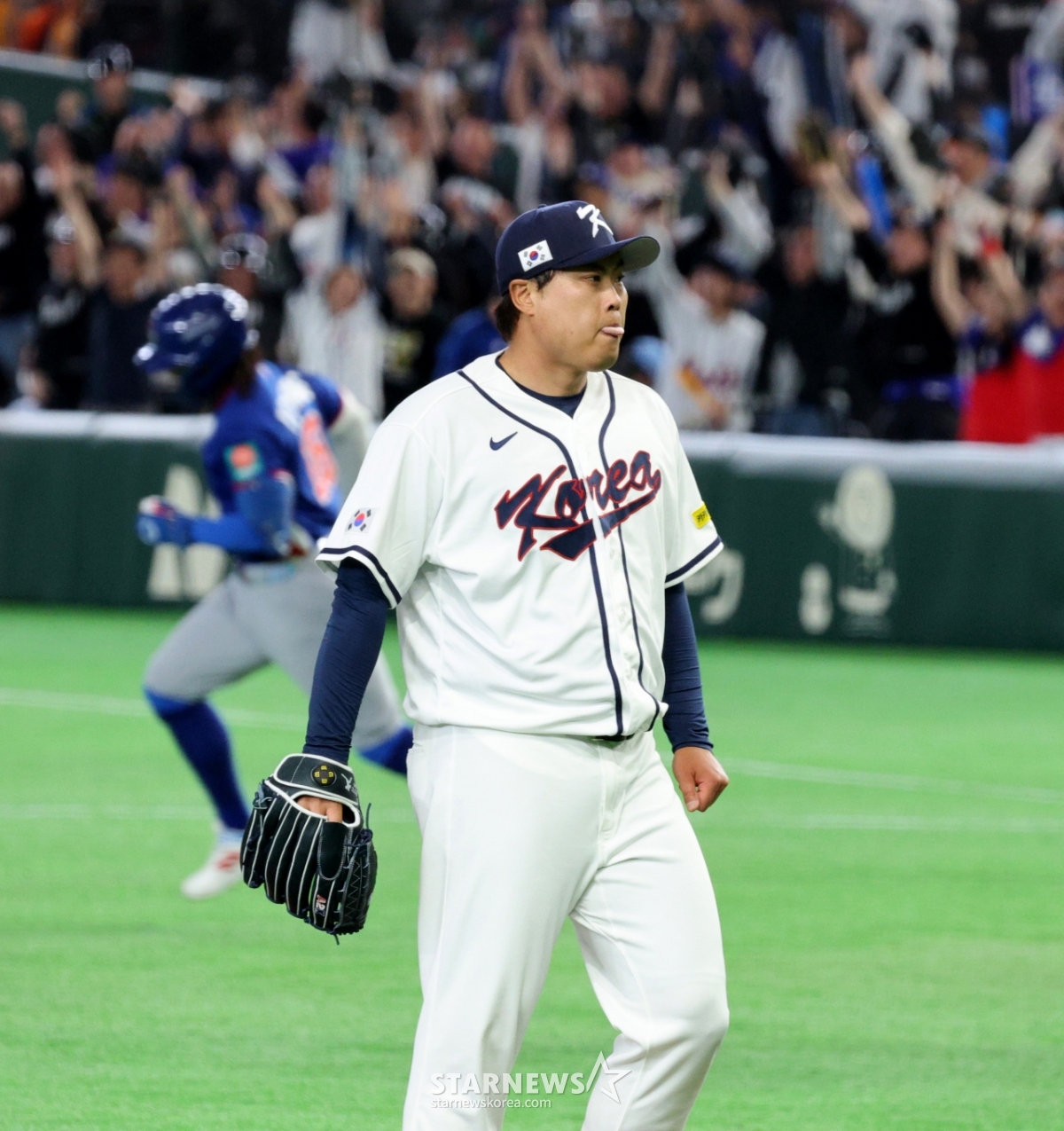 Cầu thủ ném bóng đầu tiên của Hàn Quốc Ryu Hyun-jin đang có biểu cảm cứng rắn sau khi cho phép cầu thủ đánh bóng đầu tiên Jang Yu-cheong, người đánh bóng đầu hiệp 2 của trận đấu giữa Hàn Quốc và Đài Loan được tổ chức tại Tokyo Dome vào ngày 8. 026.03.08.