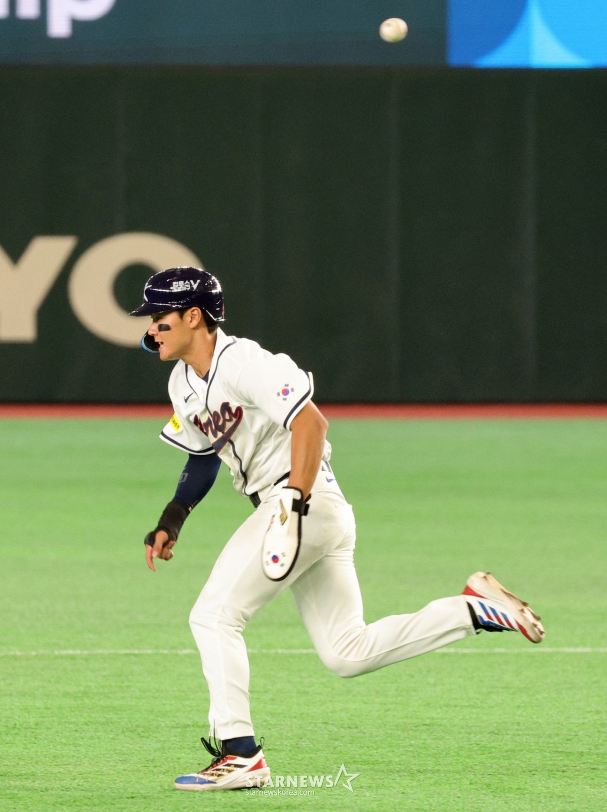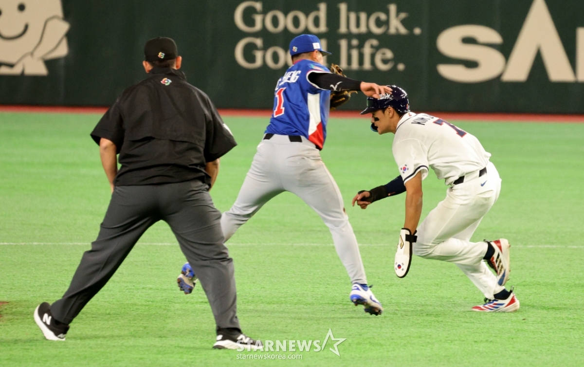 Kim Joo-won, người đánh bóng số 7 của Hàn Quốc, đang bị chặn lại trong trận đấu giữa Hàn Quốc và Đài Loan vào cuối hiệp 3 của trận đấu 2026 WBC TokyoPOOL với Park Dong-won ở gôn 1 vô sự số 8. 026.03.08.