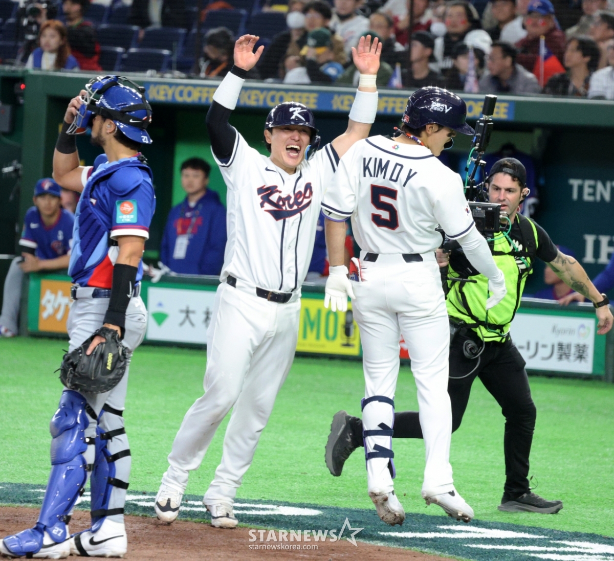 Kim Do-young, người đánh bóng số 1 của Hàn Quốc, đang về nhà sau khi đánh một cú home run lội ngược dòng tại căn cứ đầu tiên của trận đấu giữa Hàn Quốc và Đài Loan vào cuối hiệp 6 được tổ chức tại Tokyo Dome vào ngày 8. 026.03.08.