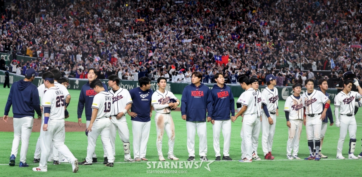 Đội trưởng đội bóng chày quốc gia Lee Jung Hoo và các cầu thủ đang bước ra sân sau khi thua trận đấu quyết định giữa Hàn Quốc và Đài Loan trong trận đấu 2026 WBC TokyoPOOL được tổ chức tại Tokyo Dome vào ngày 8. 026.03.08.