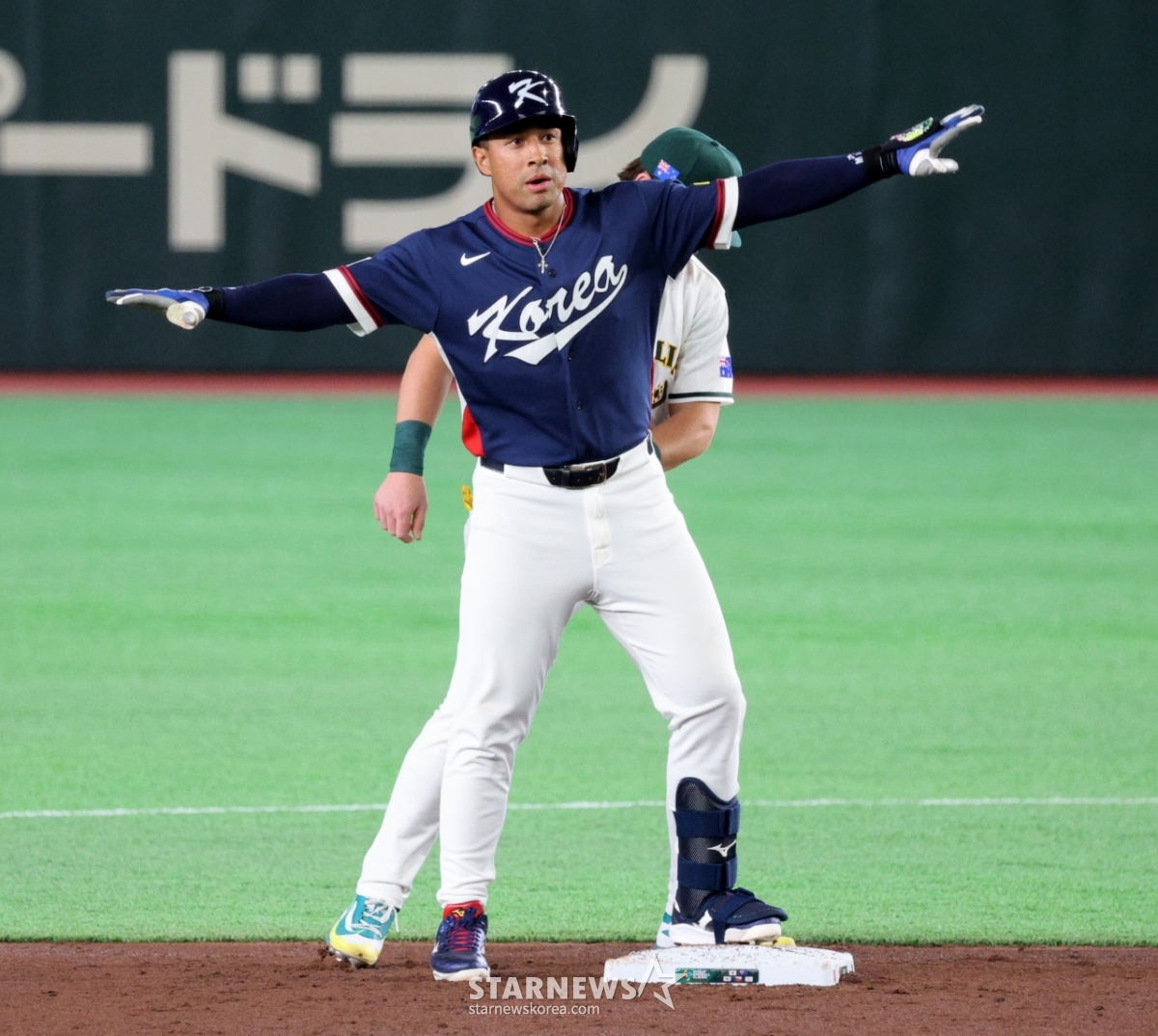 Jermy Jones, cầu thủ đánh bóng thứ hai của đội tuyển bóng chày quốc gia, đang ra sân với cú đúp trong hiệp 3 của trận đấu giữa Hàn Quốc và Úc năm 2026 WBC TokyoPOOL được tổ chức tại Tokyo Dome vào ngày 9. 026.03.08.