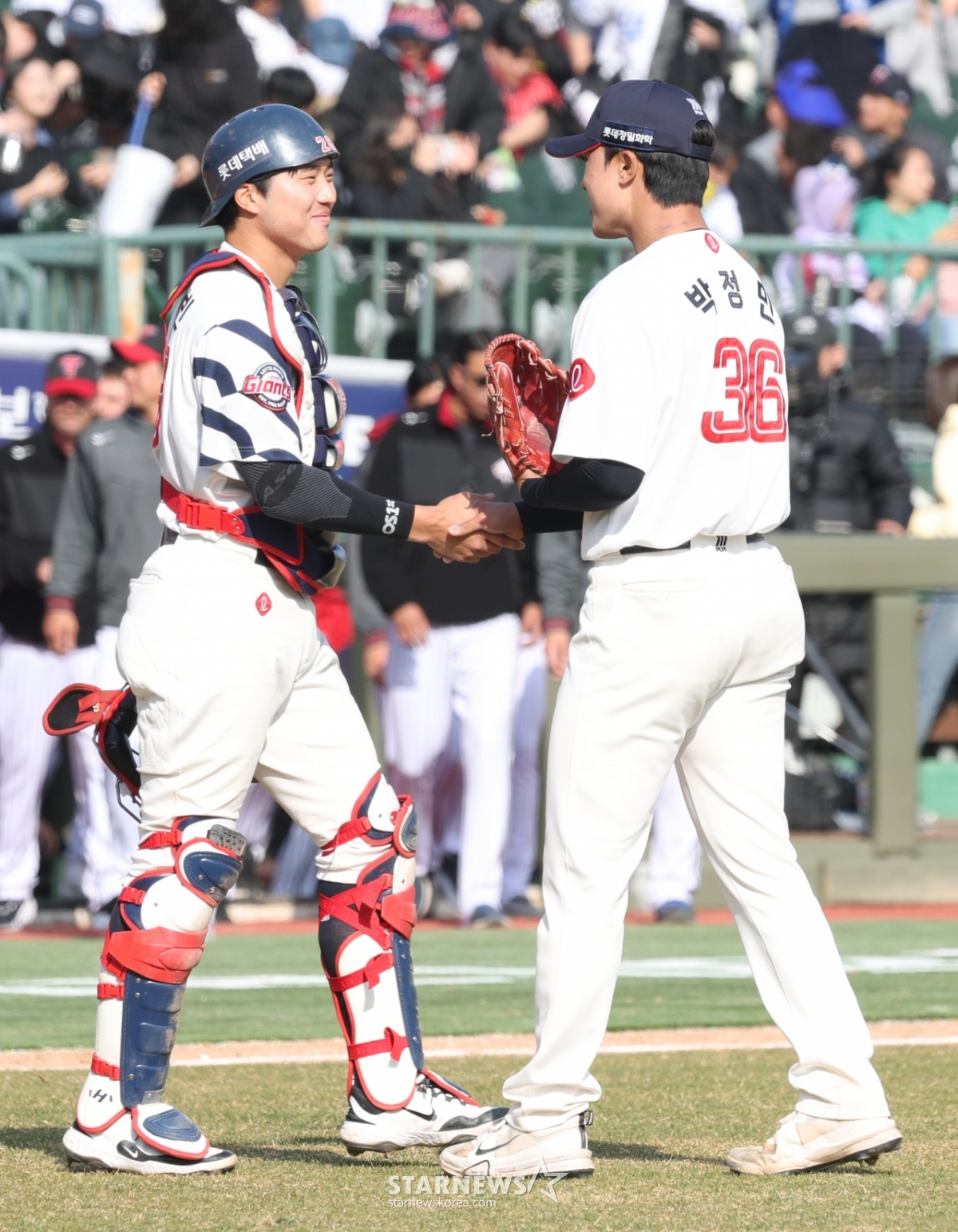 Lotte Park Jung Min đang chia sẻ niềm vui với cầu thủ bắt bóng Son Sung Bin sau khi cân nhắc trận đấu.