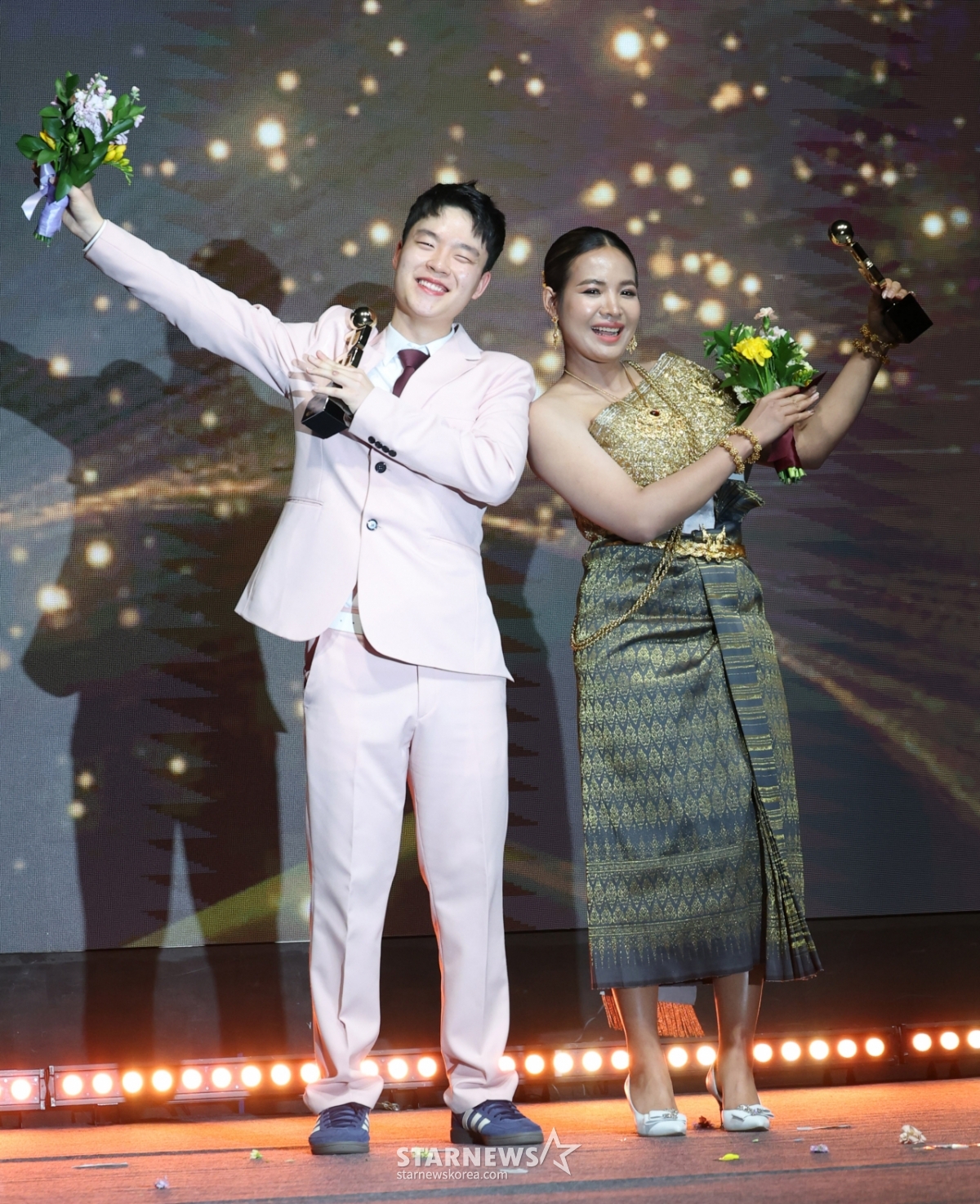 Kim Young-won (Harim) và Sron Piabi ( Woori Finance Capital) đang tạo dáng sau khi nhận được giải thưởng Best Performance Award.
