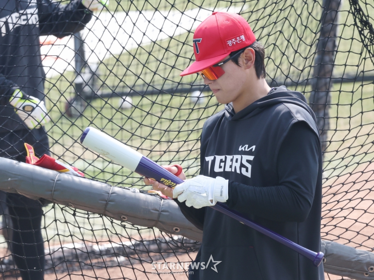 Kim Do Young của KIA đang xem xét gậy sau khi huấn luyện đánh bóng.