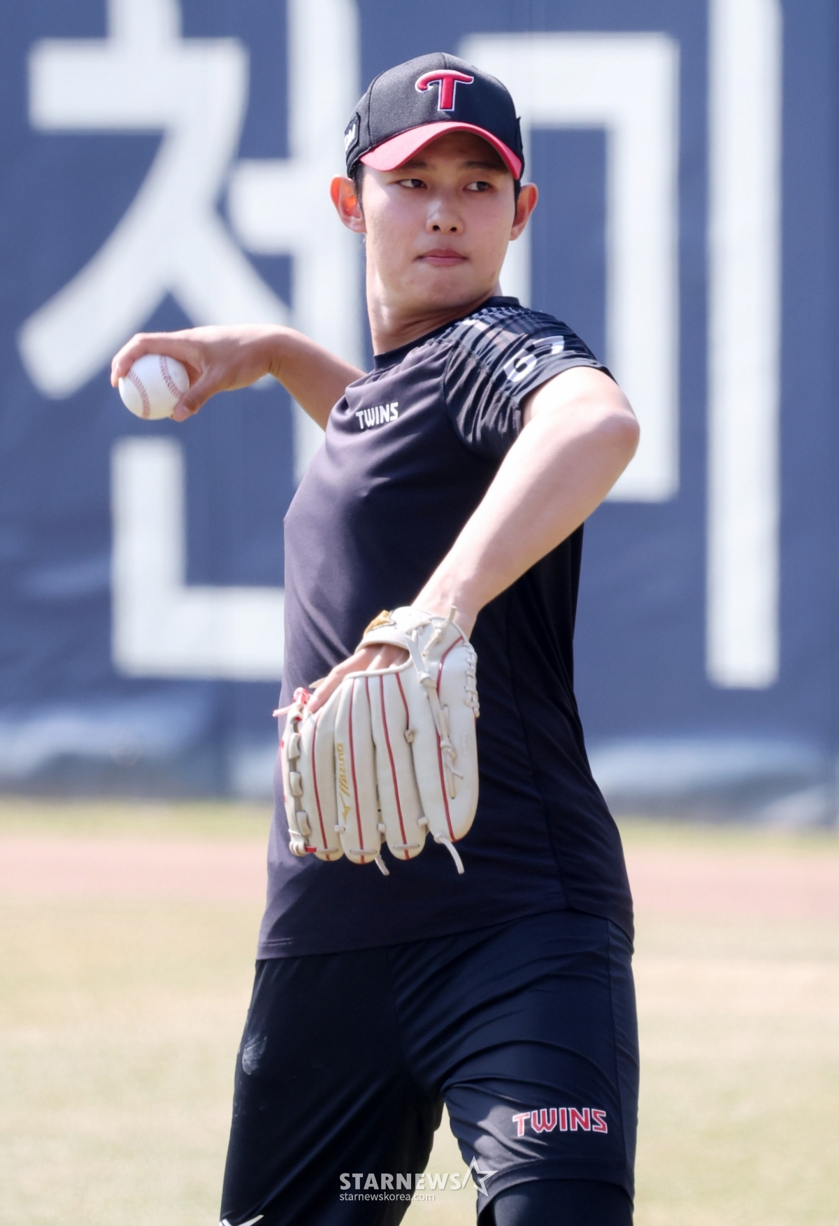 LG Kim Young-woo đang huấn luyện ném bóng ở khu vực ngoài trời.