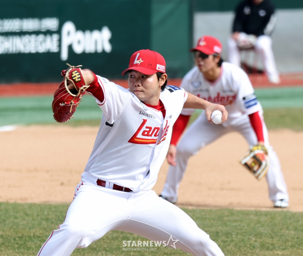 Cầu thủ ném bóng hoàn chỉnh của SSG Park Si Hoo đang chơi ở vị trí thuận lợi ở đầu hiệp 8 của trận đấu giữa SSG Landers và Lotte Giants trong trận đấu giao hữu bóng chày chuyên nghiệp 1016 được tổ chức tại Landersfield vào ngày 24. 2026.03.24.