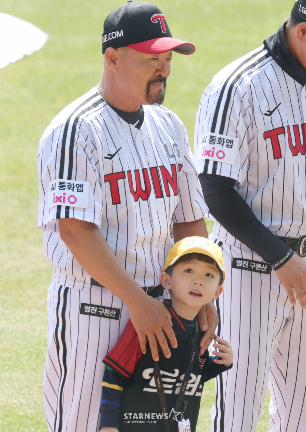 Huấn luyện viên Kim Yong Il của LG, người được chỉ định làm người ném bóng mở màn, đang xếp hàng trong sự kiện khai mạc với sự vỗ tay của người hâm mộ và lập trường của Oh Ji Hwan.