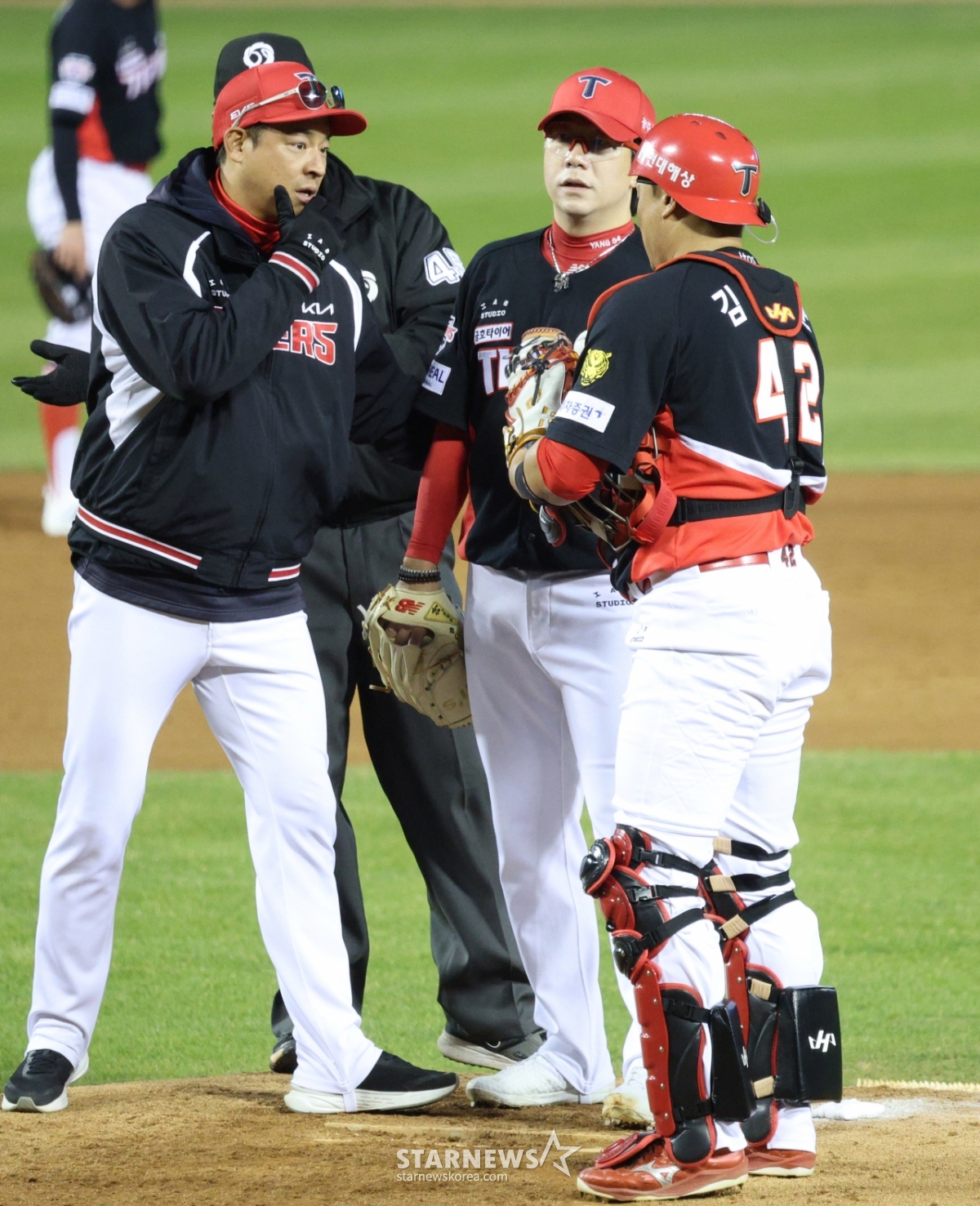 Huấn luyện viên ném bóng Yang Hyun-jong của KIA cho thấy hình ảnh rung chuyển và đang lên gò đất để kiểm tra.