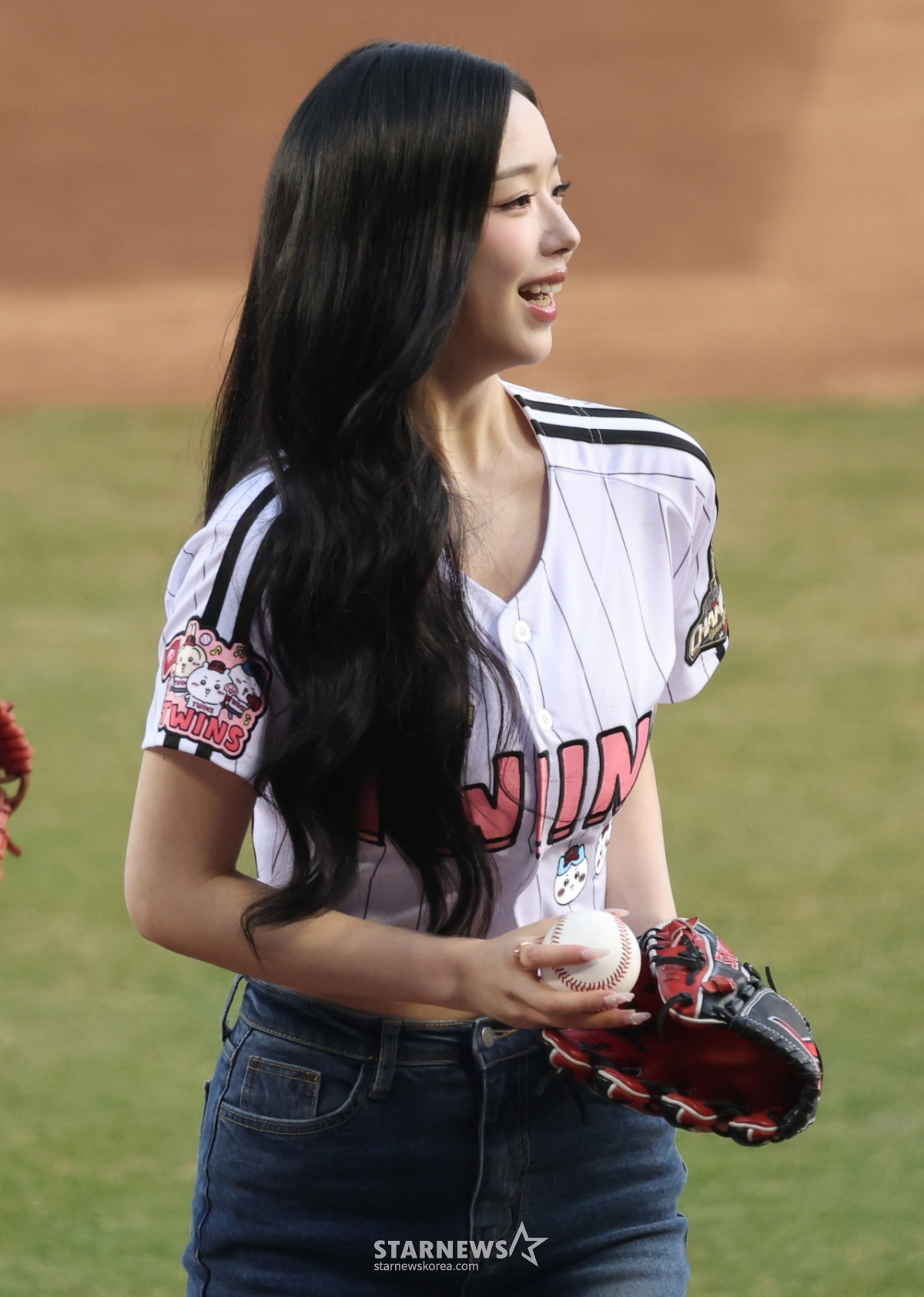 Kim Chae Yeon, thành viên của nhóm nhạc nữ Triple S, đang ném bóng mở màn cho lời cầu nguyện chiến thắng của LG.