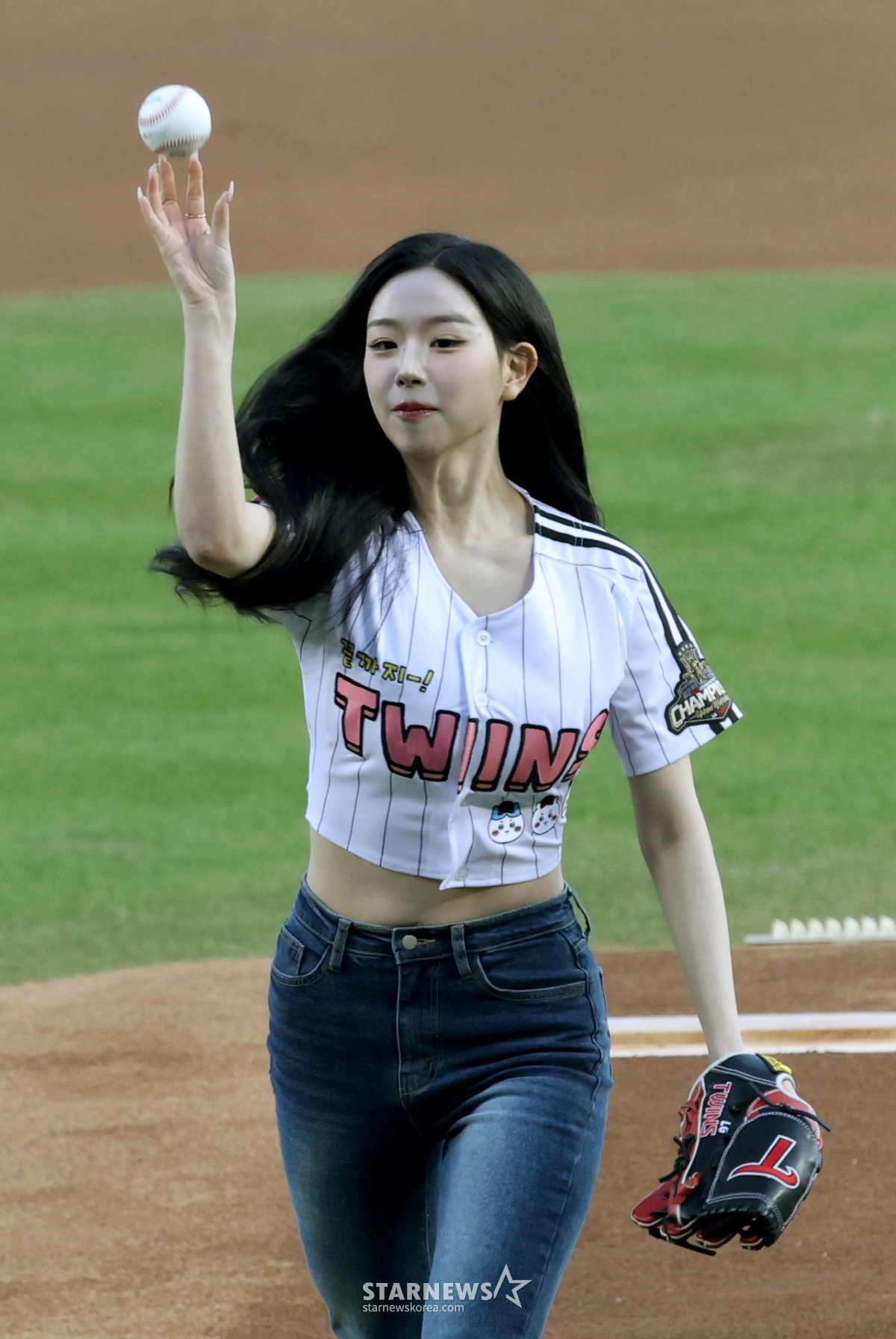 Kim Chae Yeon, thành viên của nhóm nhạc nữ Triple S, đang ném bóng mở màn cho lời cầu nguyện chiến thắng của LG.