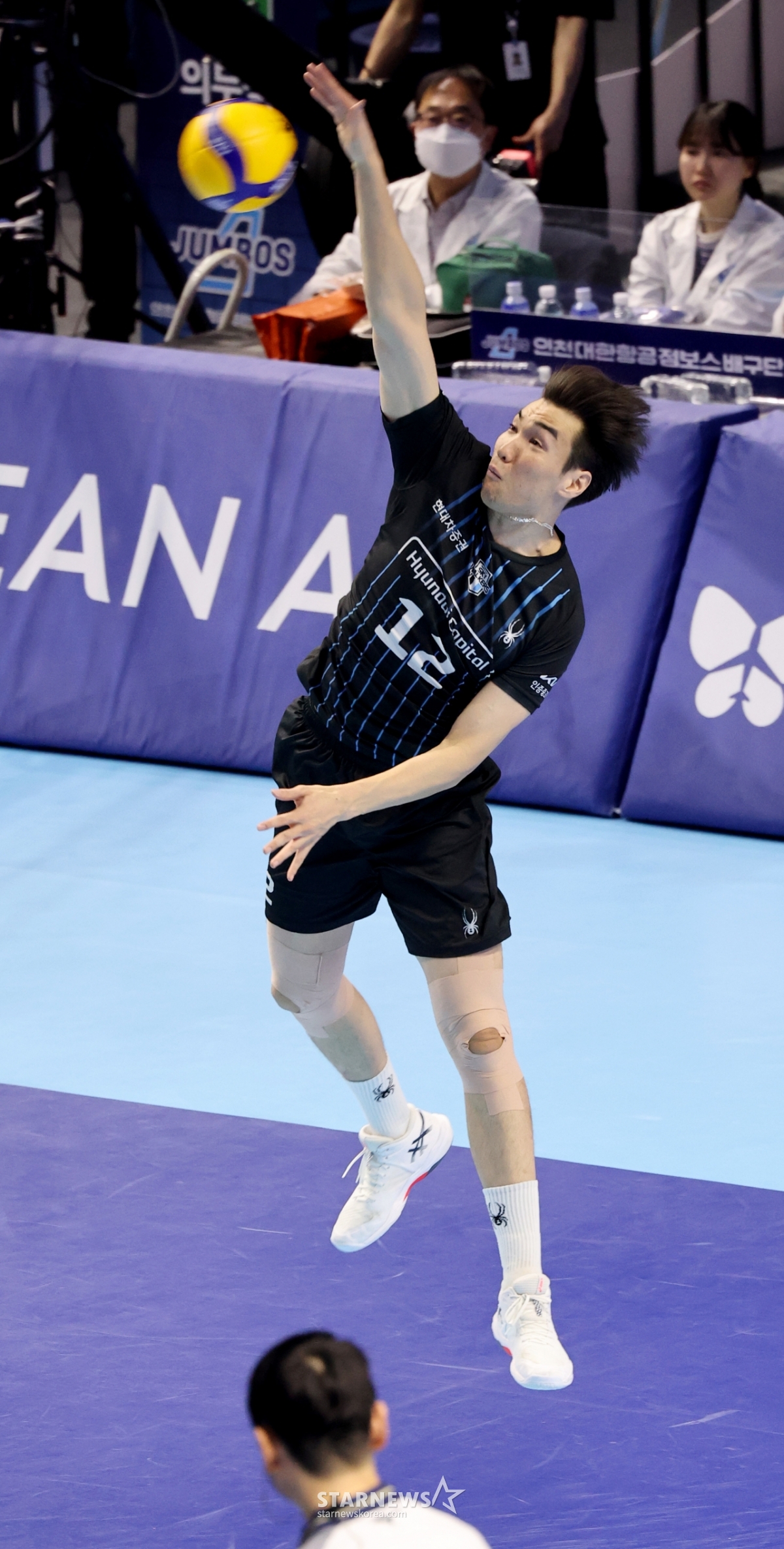 Hyundai Bayarsaihan đang thử sức trong trận đấu giữa Korean Air và Hyundai Capital trong trận chung kết vô địch giải V-League 2025-2026 được tổ chức tại Nhà thi đấu Gyeyang vào ngày 3. 2026.04.03.