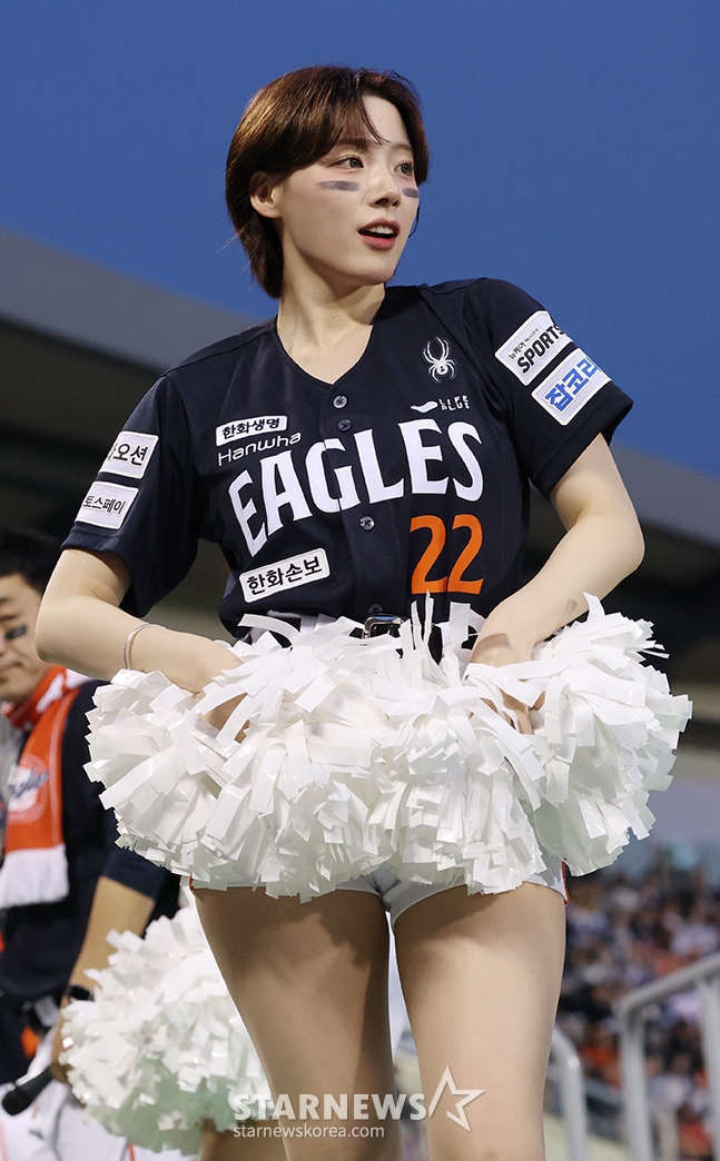Đội cổ vũ Hanwha Ha Ji Won đang cổ vũ một cách vui vẻ.