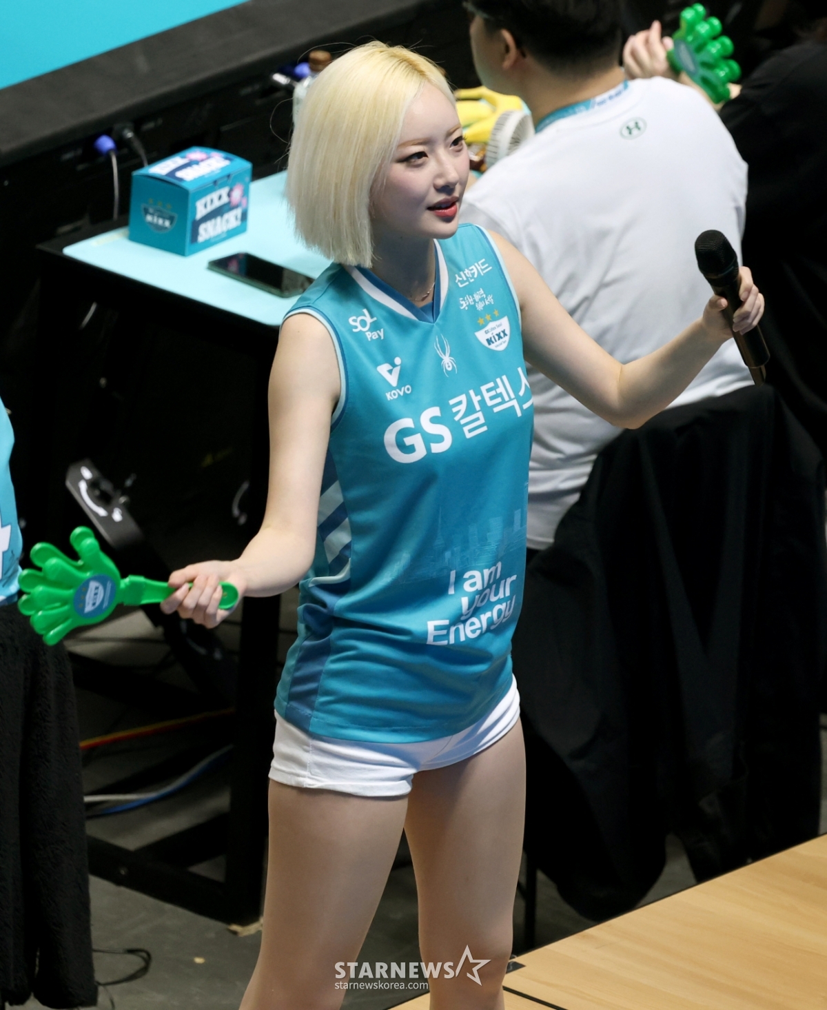 Cổ động viên cổ vũ Seo Hyun Sook của GS Caltex đang cổ vũ một cách vui vẻ.