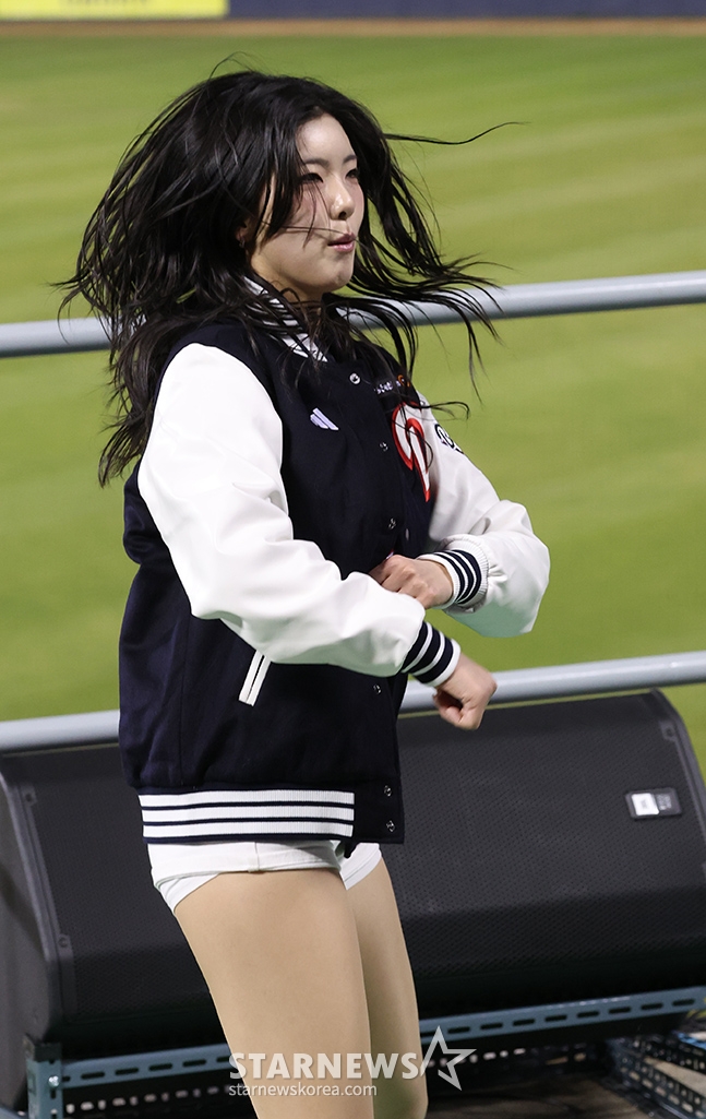 Đội cổ động viên đội Doosan Kim In Young đang cổ vũ một cách sảng khoái.