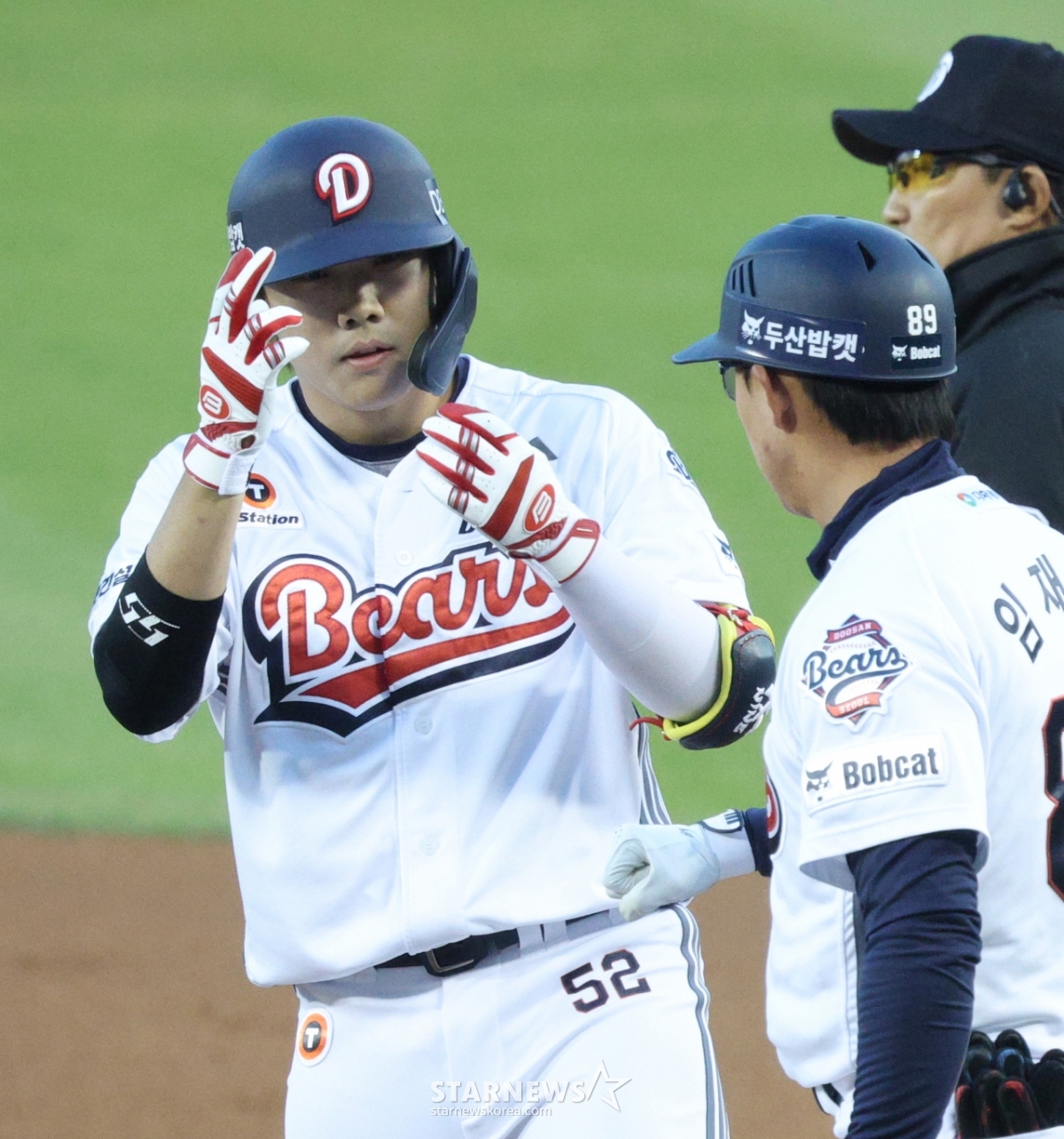 Doosan Park Jun-soon đang ăn mừng sau khi có một cú đánh trúng bóng đúng lúc với một điểm đánh trúng bóng đầu tiên tại căn cứ thứ hai ở cuối hiệp 1.