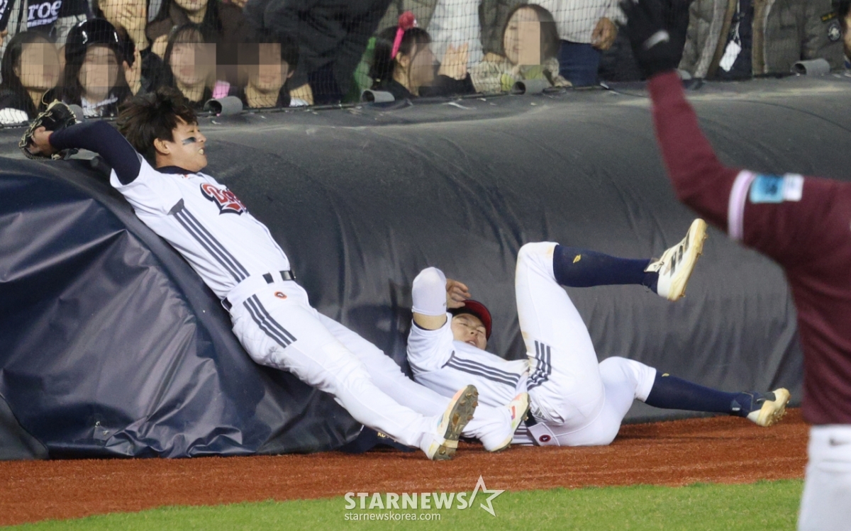 Doosan Park Chan Ho và Park Ji Hoon đang tiếc nuối sau khi bỏ lỡ sau khi va chạm với cú đánh phạm lỗi của Lee Joo Hyung khi cố gắng bắt bóng ở gôn 2 vào đầu hiệp 5.