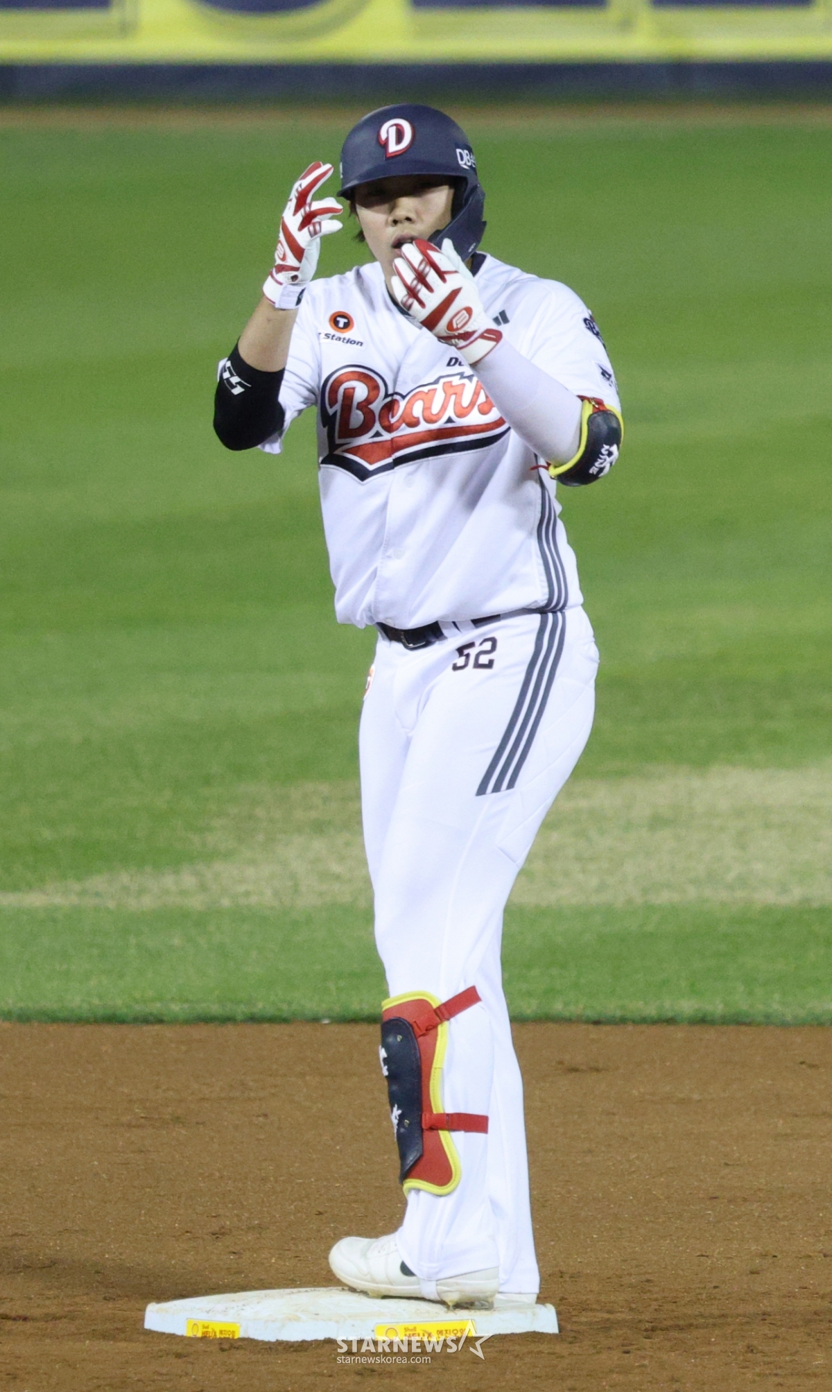 Doosan Park Jun-soon đang ăn mừng sau khi đánh một cú đúp ở giữa cánh trái và ra sân ở cuối hiệp thứ 7.