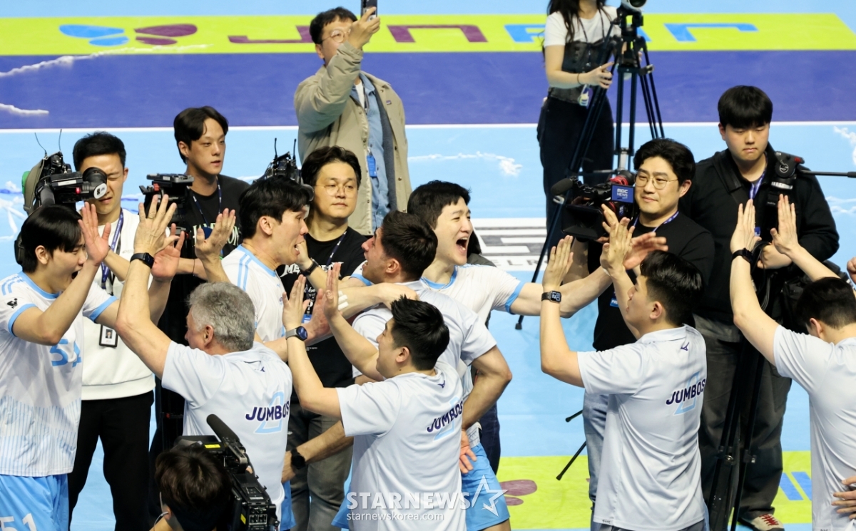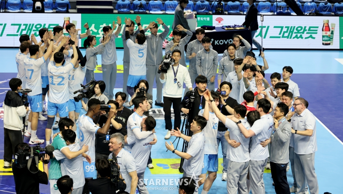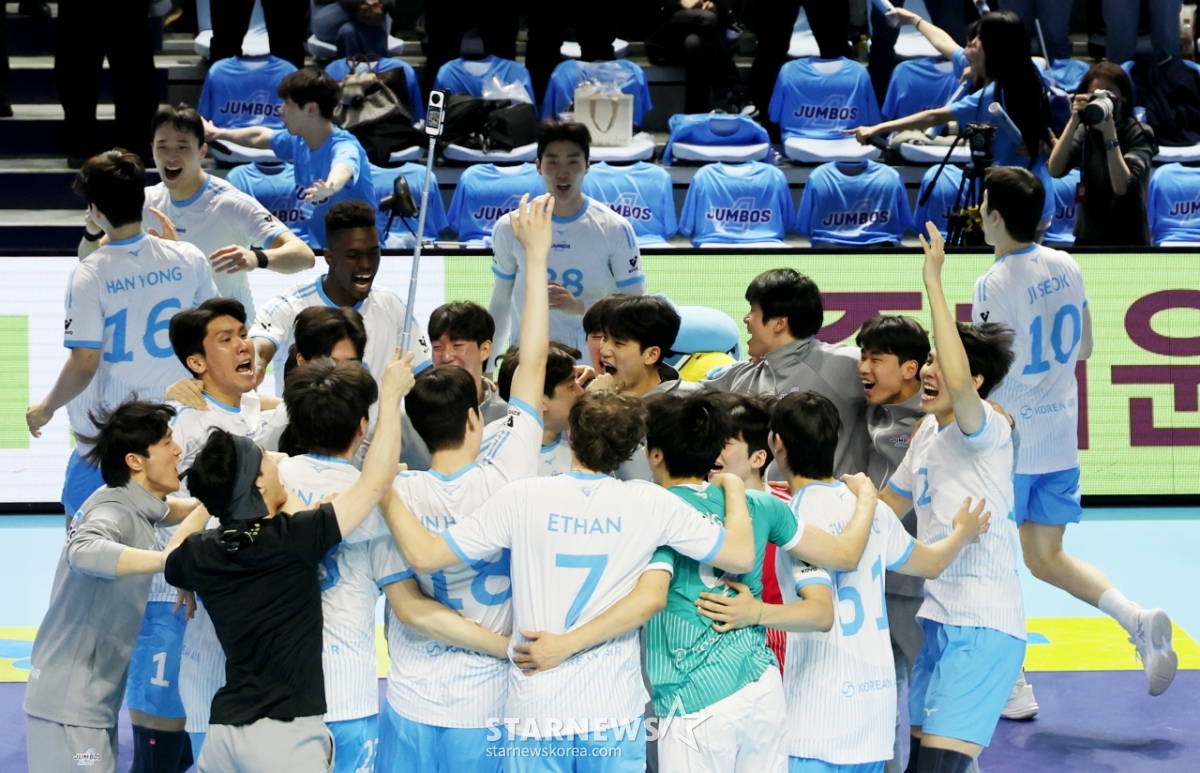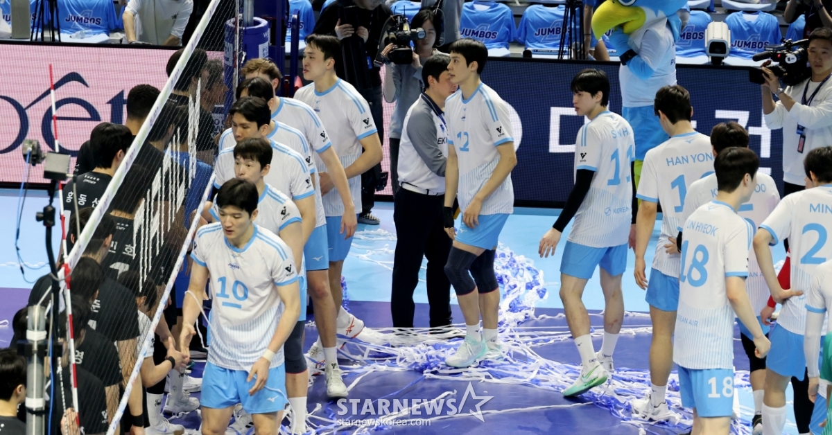 Jung Ji-seok và các cầu thủ của Korean Air đang reo hò sau khi giành chiến thắng trong trận đấu thứ 5 giữa Korean Air và Hyundai Capital trong trận chung kết vô địch V-League 2025-2026 được tổ chức tại Nhà thi đấu Gyeyang, Incheon vào ngày 10. 2026.04.10.