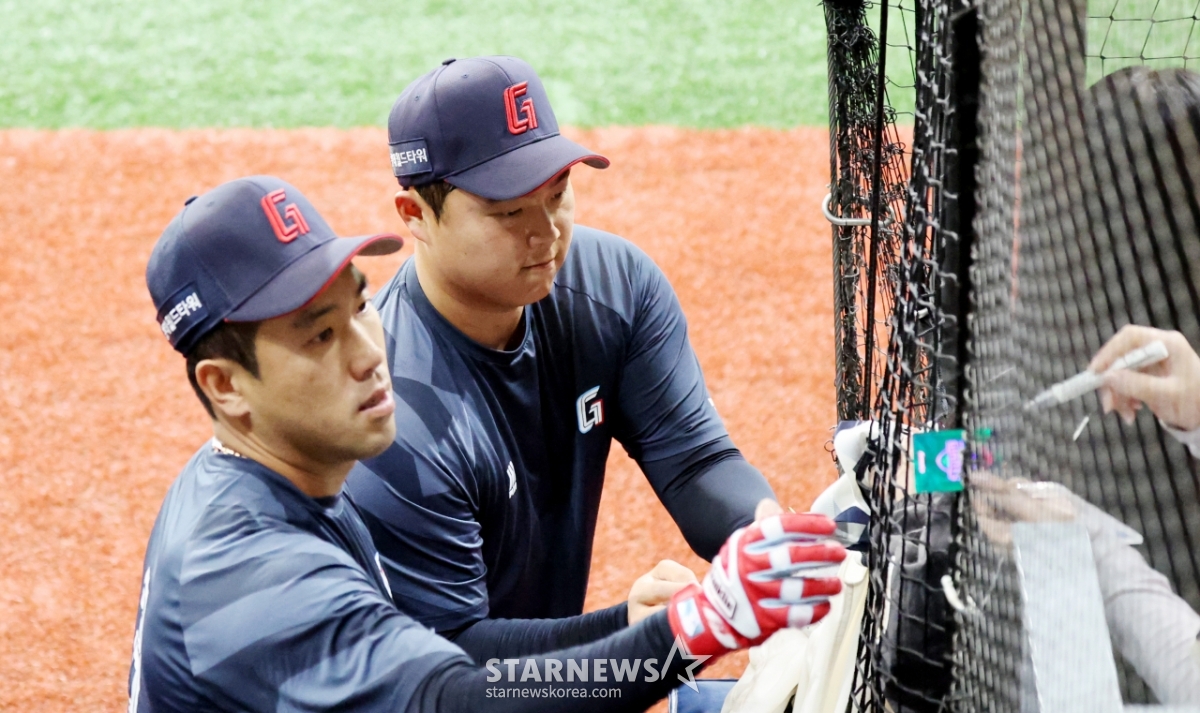 Lotte Jeon Joon Woo và Han Dong Hee đang ký tặng cho người hâm mộ trước trận đấu giữa Lotte Giants và Kirum Heroes diễn ra tại Gocheok Sky Dome vào ngày 12. 2026.04.12.